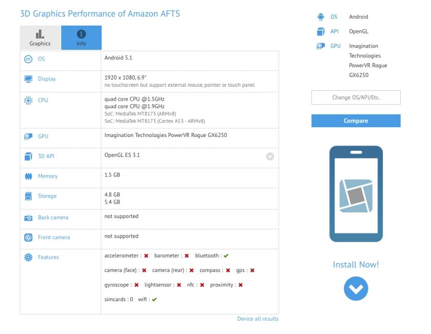 Doch was ist daran so interessant? Es ist die Hardware! Laut GFXBench basiert der Stick nämlich auf einem Mediatek MT8173 Chipsatz. Dieser Chip ist die derzeit leistungsfähigste Tablet Lösung von Mediatek und der erste erhältliche Chipsatz überhaupt der auf die neue ARM Cortex A72 Architektur setzt. Es handelt sich dabei um einen Quad-Core Chip, welcher auf zwei A72 Kerne mit knapp 2GHz Takt und weitere zwei A53 Kerne mit 1,5GHz Takt setzt. Weiterhin verfügt der SoC über eine high-end Grafiklösung von PowerVR, die Rogue GX6250. In dem gelisteten Fire TV Stick wird der Chip mit 2GB RAM und 16GB Speicher kombiniert. Als Betriebssystem läuft auf der Plattform Android 5.1.