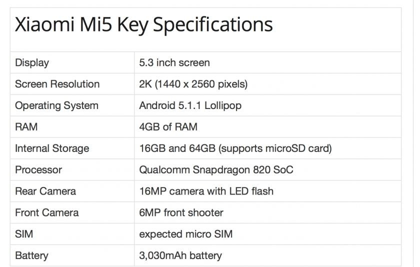 Nun gibt der Blog MobiPicker allerdings an von einer Quelle die gesamten Spezifikationen des Xiaomi Mi5 erfahren haben zu wollen. Neben dem Snapdragon 820 Chipsatz soll das Smartphone laut Angabe des Blogs ein 5,3" Display mit 2k Auflösung, 4GB RAM, 15 oder 64GB Speicher, einen Micro SD Slot, eine 16 Megapixel Kamera und einen 3.030mAh Akku bieten. Am Micro SD Slot wage ich allerdings zu zweifeln, denn es ist noch nicht lange her, als sich Xiaomi eindeutig gegen Micro SD Slots ausgesprochen hat.