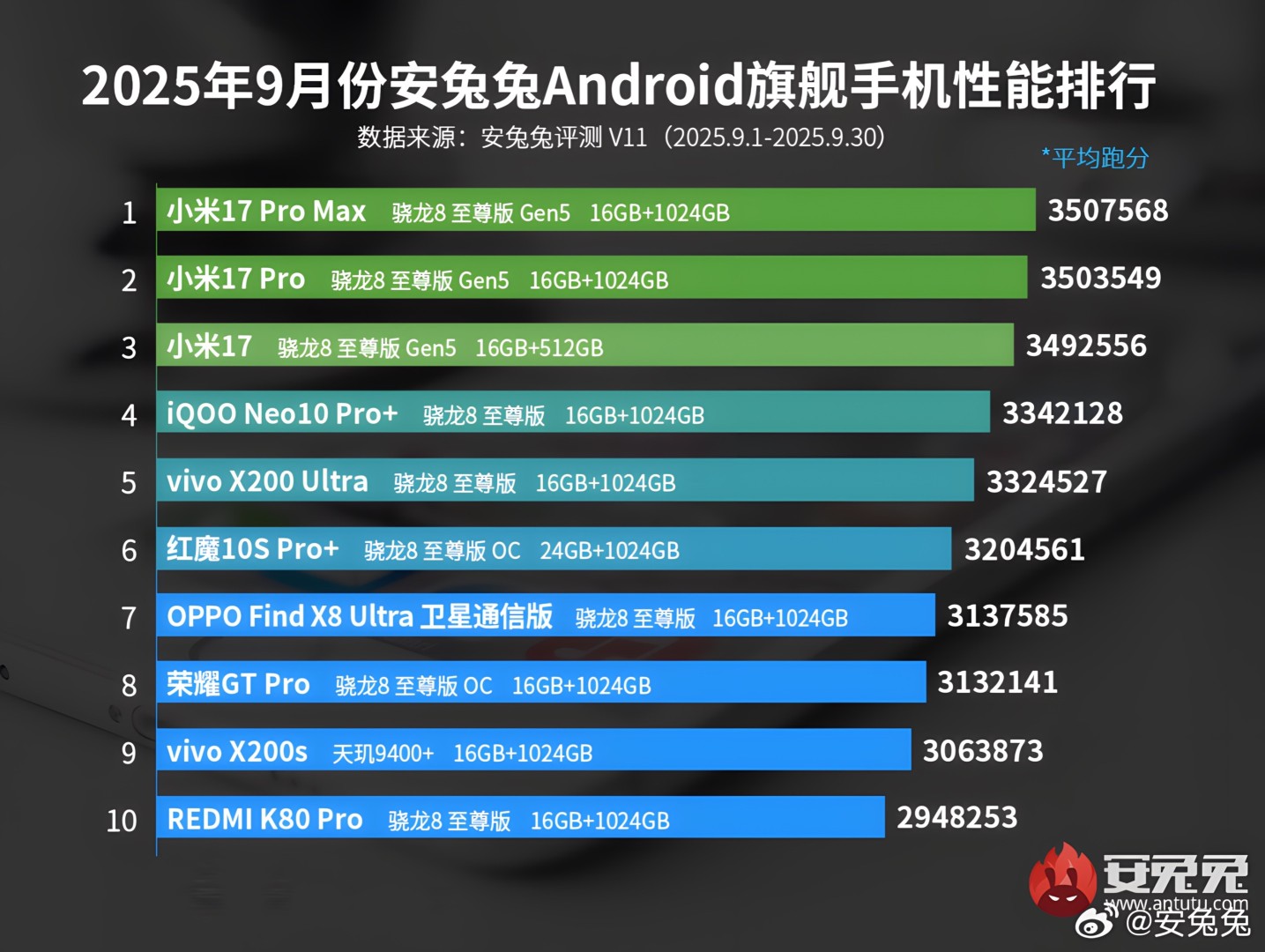 Die drei Modelle der Xiaomi 17 Serie führen zwar erwartungsgemäß das Ranking der leistungsstärksten Android-Geräte an, bleiben aber merklich unter den angekündigten Benchmark-Ergebnissen. Das Xiaomi 17 Pro Max (ab 847€ bei TradingShenzhen*) erreicht 3.507.568 Punkte, gefolgt vom Xiaomi 17 Pro (ab 757€ bei TradingShenzhen*) mit 3.503.549 Punkten und dem Xiaomi 17 (ab 627€ bei TradingShenzhen*) mit 3.492.556 Punkten. Die Abstufung nach Gerätegröße legt nahe, dass der Snapdragon 8 Elite Gen 5 erhebliche thermische Ressourcen bei der Kühlung benötigt, um seine maximale Leistung abrufen zu können. Die Vier-Millionen-Marke im Antutu Benchmark scheint unter Alltagsbedingungen kaum erreichbar zu sein.