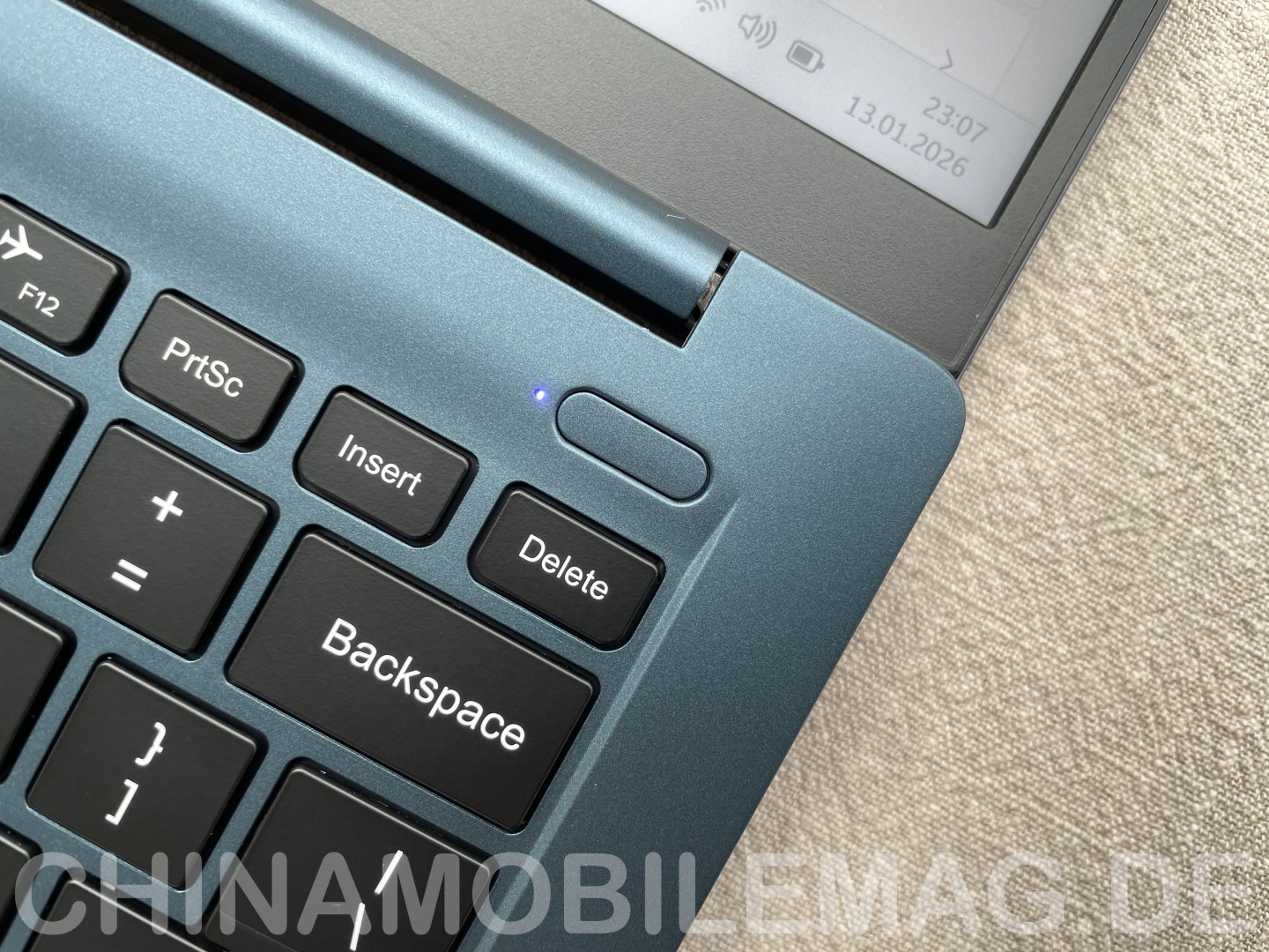 Das geringere Gewicht von nur etwas über 1kg erreicht Chuwi durch Materialeinsparungen. Der Deckel besteht nun aus Kunststoff, lediglich die Bodenplatte ist weiterhin aus Aluminium gefertigt. Dennoch fühlt sich das CoreBook Air hochwertig und angenehm an. Auch bei der Tastatur hat sich einiges getan. Die Tasten fallen etwas kleiner aus, dafür vergrößert sich der Abstand zwischen ihnen. Die Power Taste sitzt nun außerhalb der Tastatur. Das Schreibgefühl hinterlässt einen sehr guten ersten Eindruck. Die Tasten erzeugen ein leises Tippgeräusch mit dumpfem Anschlag und wenig Federung. Die zweistufige Hintergrundbeleuchtung ist gleichmäßig.