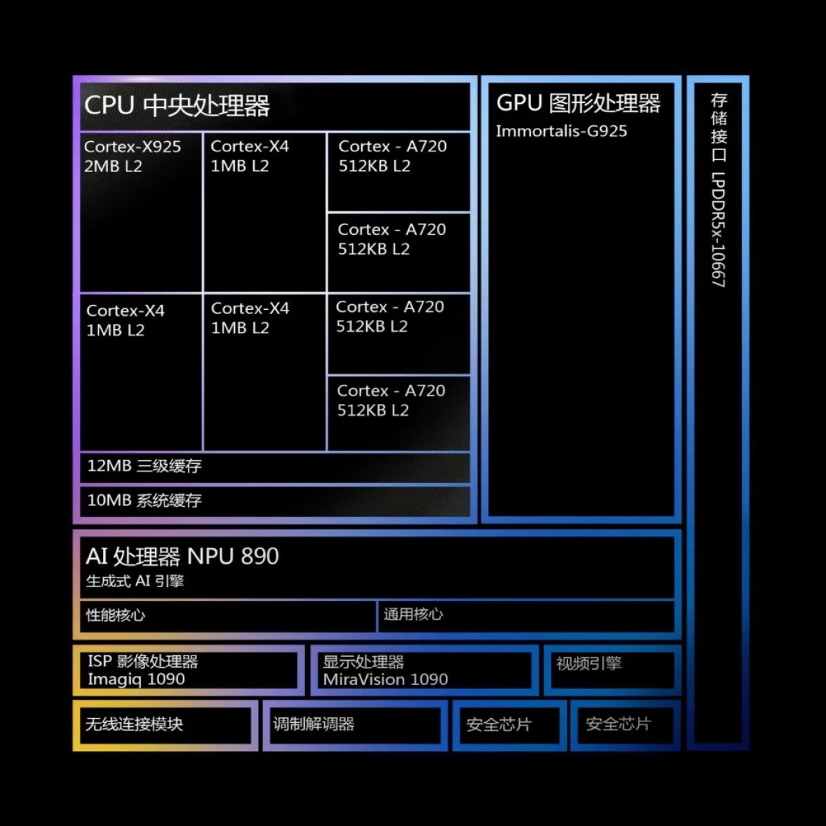 Die CPU setzt sich beim Dimensity 9400 wieder ausschließlich aus "großen" Kernen zusammen, verzichtet also komplett auf ARMs Effizienzkerne. Insgesamt gibt es wie gehabt 8 CPU Kerne, welche in drei Cluster unterteilt werden. Beim leistungsfähigsten Kern handelt es sich um einen ARM Cortex X925, der mit bis zu 3,62GHz getaktet wird. Dem folgen dann drei Cortex X4 Kerne mit maximal 3,3GHz sowie vier Cortex A720 Kerne mit bis zu 2,4GHz. Bei der GPU handelt es sich, wie bereits zuvor bekannt geworden ist, um die ARM Immortalis G925 (12 Kerne), die mit satten 1,612GHz läuft und voraussichtlich der Konkurrenz von Qualcomm gewachsen sein wird.