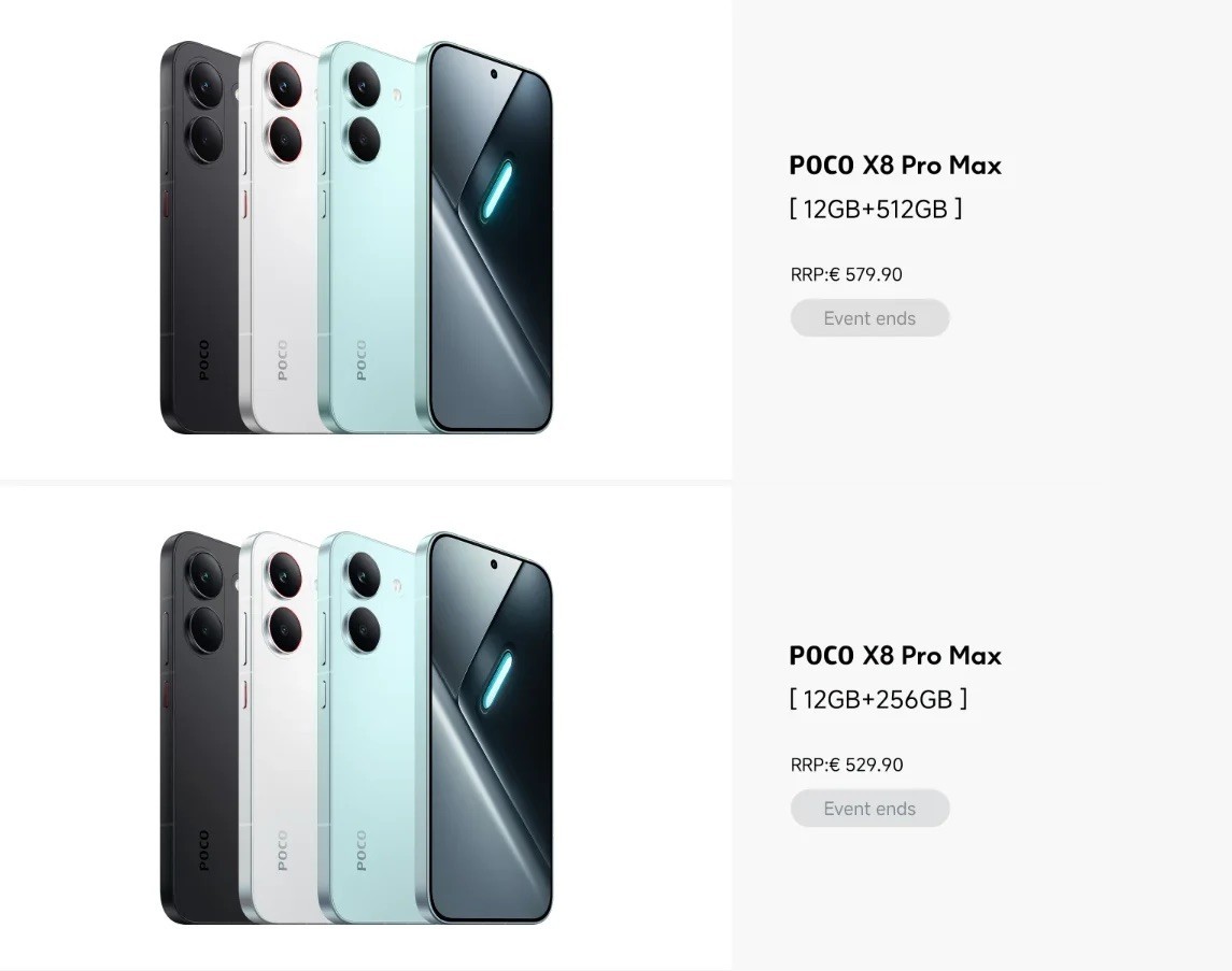 Die versehentlich veröffentlichte Seite bestätigte die europäischen Preise für beide Modelle. Das Poco X8 Pro startet demnach bei 399,90€ für die Variante mit 8GB RAM und 256GB Speicher. Die mittlere Ausstattung mit 8GB RAM und 512GB Speicher kostet 449,90€, während die Topversion mit 12GB RAM und 512GB Speicher für 479,90€ erhältlich sein wird.