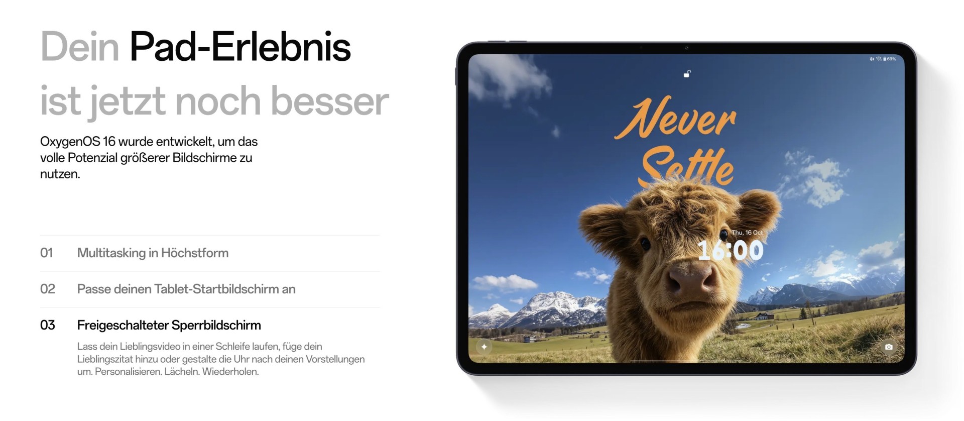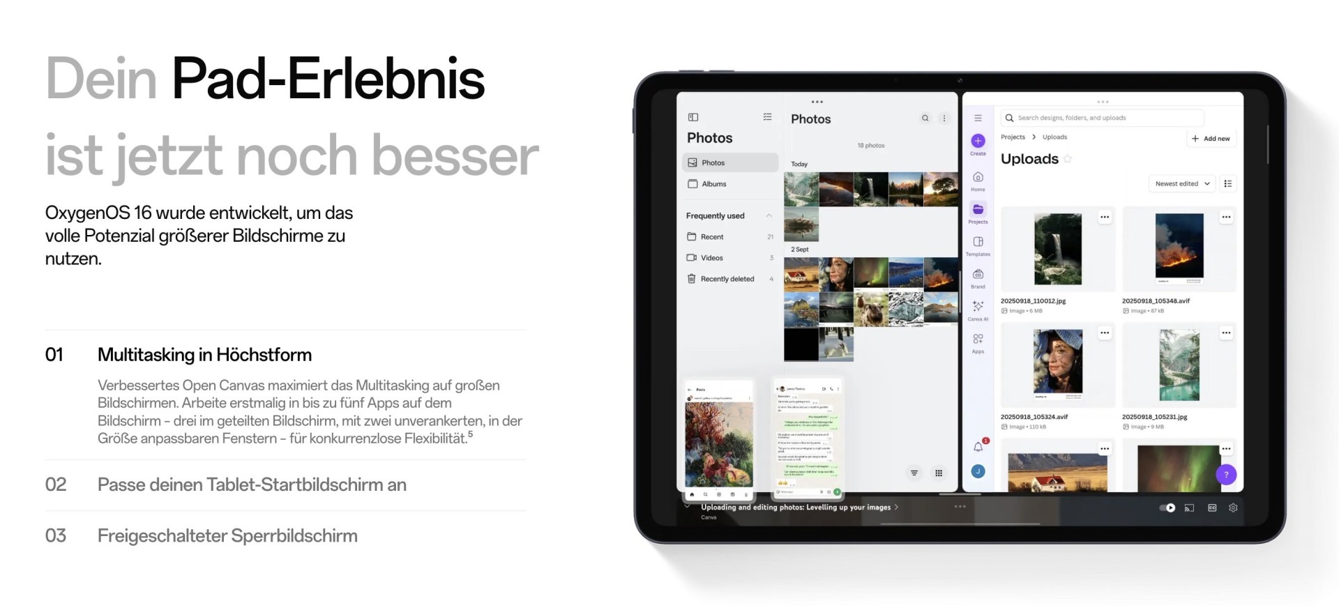 Für Tablets bringt OxygenOS 16 einen überarbeiteten Homescreen mit skalierbaren Icons und einem erweiterten Dock für bis zu 18 Apps. Open Canvas unterstützt nun fünf simultane Apps, davon drei im Split-View und zwei als anpassbare Floating-Windows. Die Photos-App erhält integrierte Videobearbeitungsoptionen zum Schneiden von Clips, Hinzufügen von Musik und Untertiteln sowie zum Konvertieren von Videos in MotionPhotos.