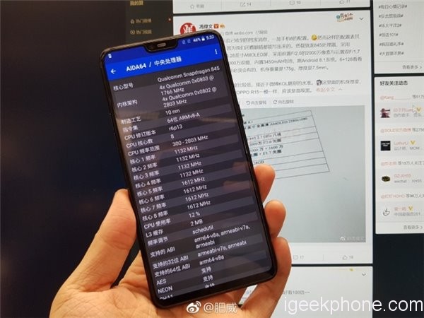 Auf der Front bekommt man mit den neuen Bildern nun einen sehr schönen Eindruck vom Notch. Dieser steht tatsächlich nicht sehr weit ins Display hinein und entspricht wie von OnePlus versprochen der Höhe der Benachrichtigungsleiste, um welche das Display nach Oben hin verlängert wurde. Man verliert also durch den Notch keinen Platz, im Gegenteil, man gewinnt etwas Platz auf den Bildschirm. Wir kürzlich bekannt gegeben wurde, wird man den Notch trotzdem verstecken können, indem der Bereich des Displays schwarz geschaltet wird. Der Rand unter dem Display wurde auf ein Minimum reduziert, was zu einem deutlich besseren Verhältnis von Gehäuse zu Bildschirm führt als noch beim Vorgänger. Bestätigt wird von dem Foto darüber hinaus, dass im OnePlus 6 ein Snapdragon 845 zum Einsatz kommt, doch das ist keine Überraschung mehr.