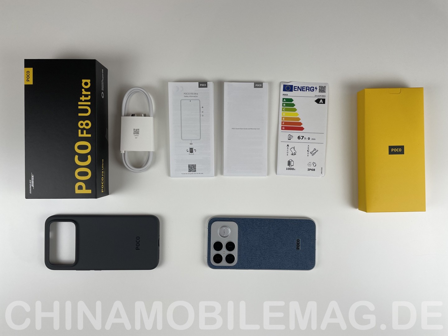 Die Verpackung des Poco F8 Ultra folgt dem typischen Format der Marke: ein schwarzer Deckel, ein gelber Innenkarton, schlichte Gestaltung ohne Produktabbildung auf der Außenseite. Das Smartphone selbst liegt in einer Kunststofftüte, auf dem Display ist ab Werk bereits eine Schutzfolie angebracht. Ein zweiter gelber Innenkarton enthält das restliche Zubehör, bestehend aus einer flexiblen schwarzen Schutzhülle, einer SIM Nadel, einem USB-A auf USB-C Kabel sowie der üblichen Dokumentation inklusive EU Energielabel. Beim Kabel handelt es sich lediglich um USB 2.0. Ein Netzteil liegt, wie bereits erwähnt, nicht bei.