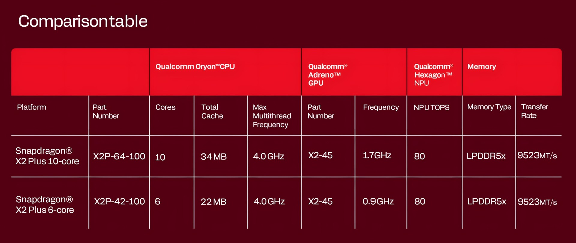 Die Snapdragon X2 Plus Serie umfasst zwei Modelle: den 10-Kern-Prozessor X2P-64-100 und die 6-Kern-Variante X2P-42-100. Beide Chips basieren auf der dritten Generation der Oryon-CPU-Architektur und werden bei TSMC im 3-Nanometer-Verfahren gefertigt. Die Kernaufteilung folgt dabei dem Konzept der teureren Elite-Modelle mit einer Unterscheidung zwischen Prime- und Performance-Kernen.
