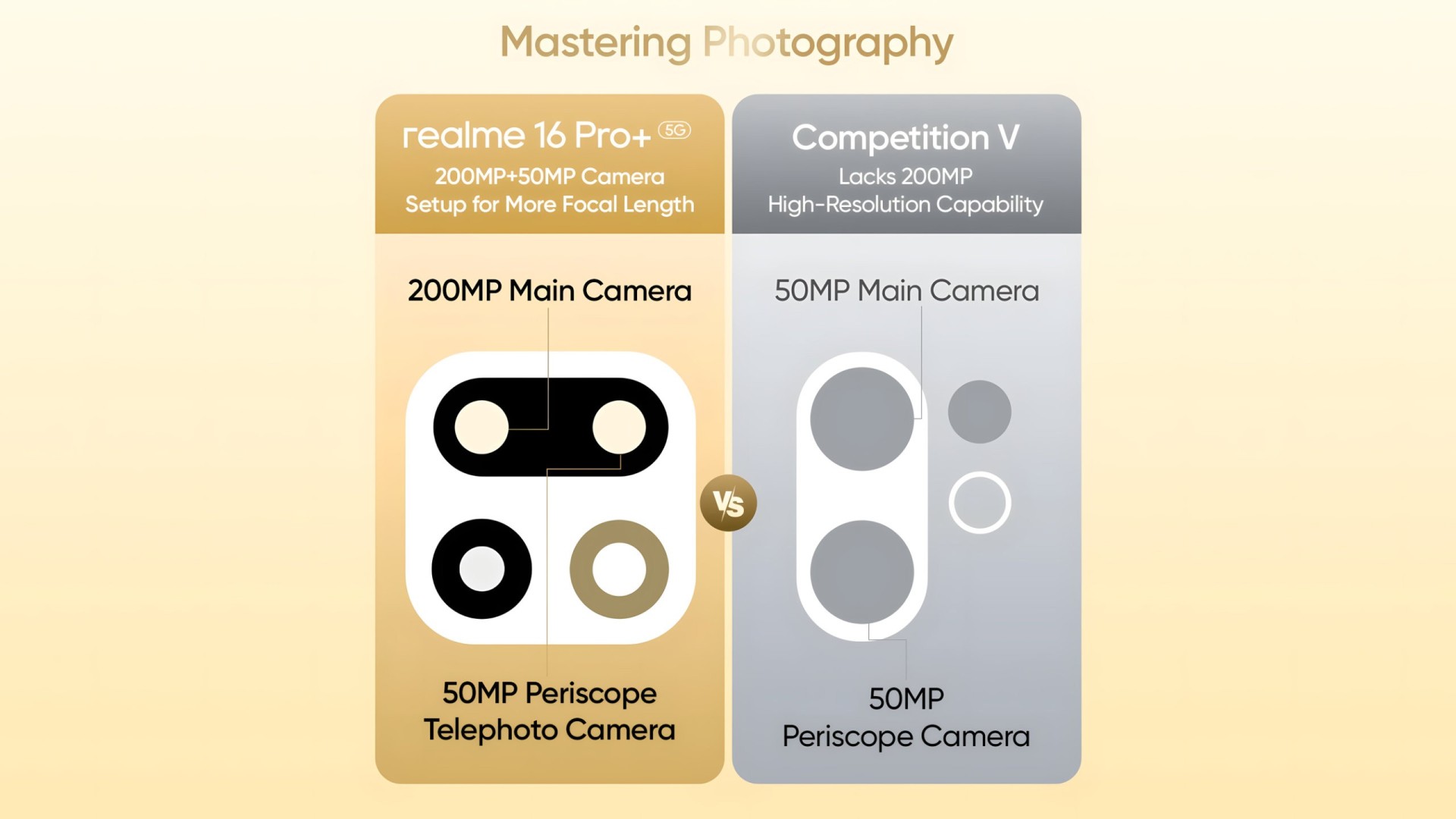 Beide Modelle der Serie, das Realme 16 Pro und das Realme 16 Pro+, erhalten eine 200MP Hauptkamera. Realme setzt dabei auf den Samsung HP5 Sensor mit einer Größe von 1/1,56 Zoll und einer Blende von f/1.8. Die Hauptkamera soll einen verlustfreien 2-fach Zoom ermöglichen.