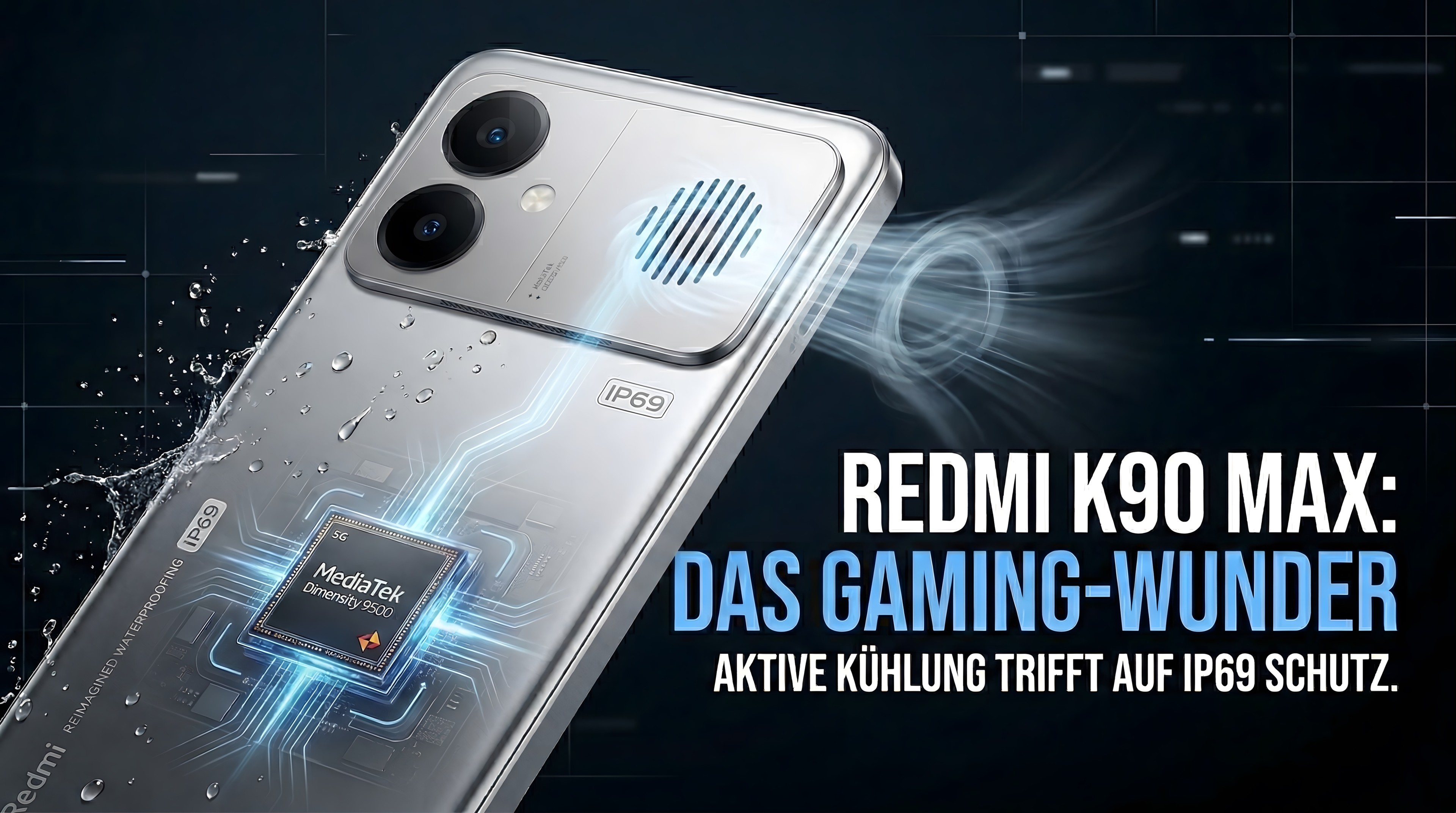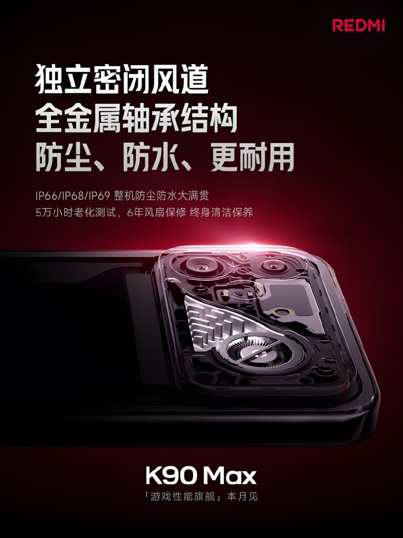 Eine technische Besonderheit stellt die Zertifizierung nach IP66, IP68 und IP69 dar. Bisher war die Kombination aus einer Gehäuseöffnung für einen Lüfter und einem hohen Schutz gegen Wasser und Staub technisch schwer realisierbar. Beim Redmi K90 Max nutzt Xiaomi einen isolierten und versiegelten Luftkanal, der den Luftstrom physisch von der empfindlichen Elektronik im Inneren trennt. Damit ist das Gerät sogar gegen Hochdruckwasserstrahlen geschützt. Um die Langlebigkeit der mechanischen Komponenten zu unterstreichen, gewährt der Hersteller eine sechsjährige Garantie auf das Kühlsystem sowie eine lebenslange kostenlose Reinigung und Wartung des Lüfters.