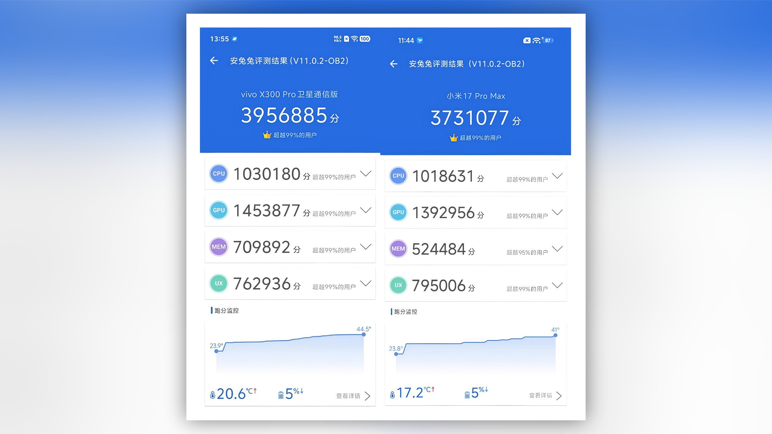 Allerdings offenbart eine genauere Analyse der Benchmark-Screenshots einen wichtigen Aspekt: Der Dimensity 9500 läuft keineswegs kühler als der Snapdragon 8 Elite Gen 5. Im Gegenteil, während des Benchmarks stieg die Temperatur des Vivo X300 Pro von 23,9°C auf 44,5°C, was einer Differenz von 20,6°C entspricht. Das Xiaomi 17 Pro Max mit Snapdragon 8 Elite Gen 5 erwärmte sich dagegen von 23,8°C auf 41°C, eine Differenz von lediglich 17,2°C.
