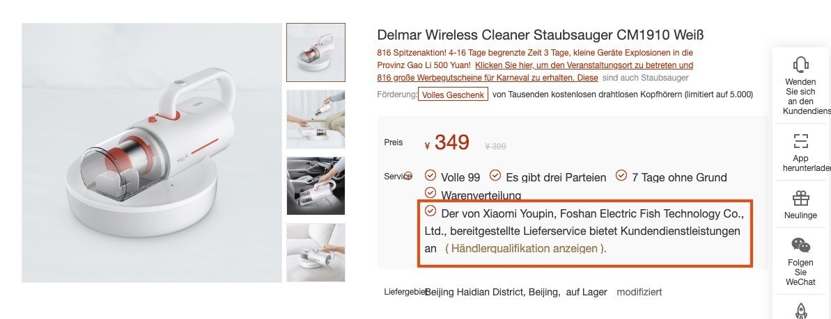 Eine Besonderheit im Fall dieser Marke: Deerma nutzt den Logistik Service von Xiaomi's Youpin Plattform. Aus diesem Grund wird auf den Youpin Produktseiten auch das entsprechende Unternehmen von Xiaomi genannt und nicht wie sonst der jeweilige Hersteller als Dienstleister. Das allein bedeutet allerdings noch lange nicht, dass die Geräte von Xiaomi produziert werden. Der Hinweis ist ähnlich zu verstehen wie beispielsweise die Versandinformationen auf Amazon (Verkauf durch XYZ, Versand durch Amazon). Xiaomi verwaltet in diesem Zuge auch Rückläufer und Reklamationen von Kunden - genau wie Amazon.