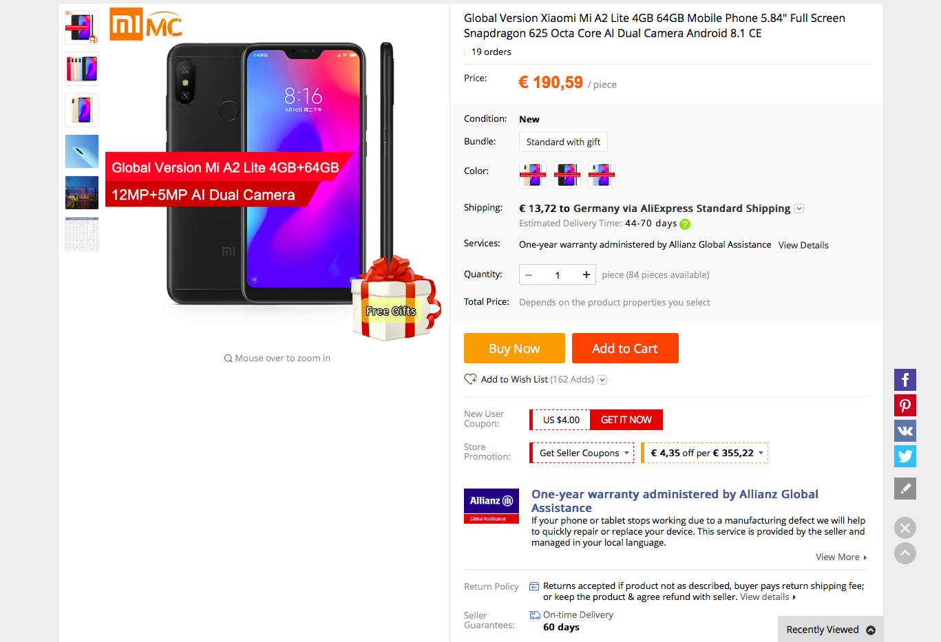 Für die Vorbestell-Angebote auf Aliexpress ist der Händler "Xiaomi MC Store" verantwortlich. Dieser Händler ist bereits seit 2016 auf Aliexpress aktiv und mit 99% bei über 68.000 Bewertungen recht positiv bewertet. Es handelt sich also nicht um einen Betrüger. Eine Vorbestellung ist bei Aliexpress ohnehin mit keinem Risiko verbunden, da ihr über den Käuferschutz voll abgesichert seit. Der Händler bekommt sein Geld ohnehin erst, nachdem ihr den Erhalt der Ware bestätigt habt. Zusätzlich bietet Aliexpress nach wie vor auf Smartphones und Tablets eine kostenlose Versicherung der Allianz Global Assistance. Diese sichert euch ein Jahr lang gegenüber unverschuldeten Defekten sowie unkooperativen Verkäufern ab. Die entsprechende Versicherungspolice wird euch nach dem Kauf automatisch ausgestellt.