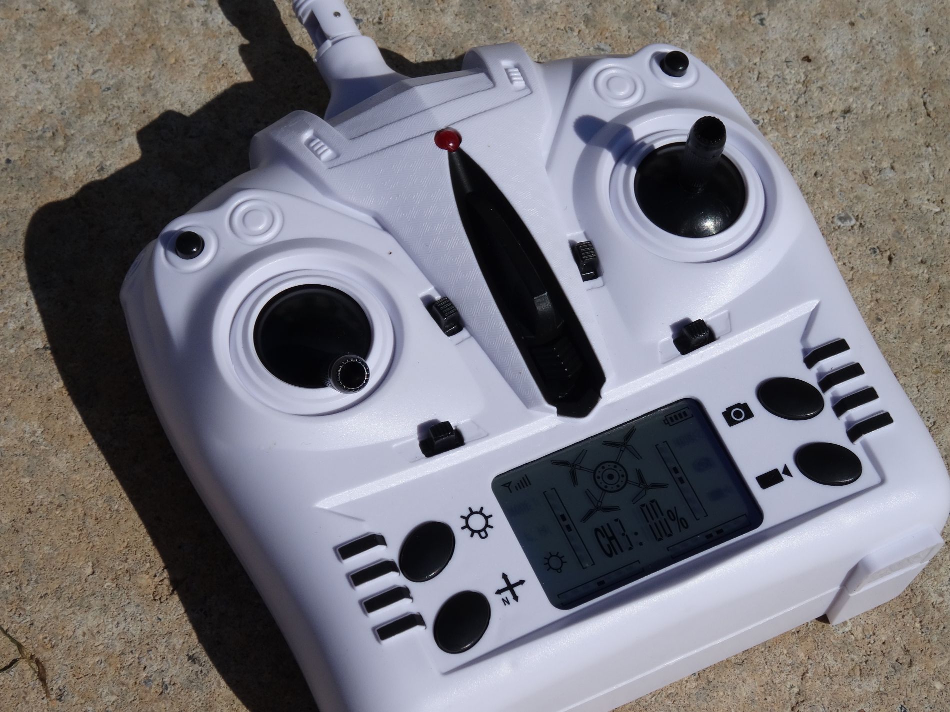 Die Steuerung an sich liegt gut in der Hand und ist nicht zu überladen. Die Bedienung ist ziemlich intuitiv und geht leicht von der Hand. Im unteren Teil der Steuerung findet sich noch ein LCD-Display, das aktuelle Informationen zum Batteriestatus der Fernbedienung, der Einstellung der Trimmung und dem Sensitivitäts-Level des Flugcontrollers anzeigt. Neben dem Display befinden sich einige Knöpfe für die Steuerung der mitgelieferten Kamera, für die Return-Home-Funktion und die Einstellung der Empfindlichkeit. Neben den Hebeln für die Trimmung und den Steuerknüppeln gibt es im oberen Teil der Fernsteuerung rechts und links noch ein Knopf. Der Linke aktiviert den Headless-Mode und der rechte aktiviert die Salto-Funktion, der dann nach dem Wählen der gewünschten Richtung, in die der Überschlag ausgeführt werden soll, ausgelöst wird.