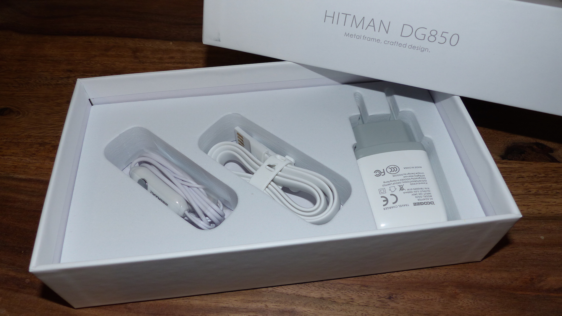 Schon alleine die Box ist so ganz untypisch für einen günstigen Klon aus Fernost. So eine professionell gestaltete Verpackung habe ich bisher bei noch keinem Smartphone gesehen, welches sich weit unter der 170 US Dollar Grenze bewegt. Nach dem Öffnen der Verpackung klappte mir die Kinnlade dann allmählich nach unten. Zuerst erschien eine semi-transparente Plastik Trennfolie mit Doogee Logo, welche die Sicht auf das darunter liegende Smartphone in der üblichen Plastiktüte versperrte, um welches sich noch ein Plastik Bumper zum Schutz der Rückseite befindet. Darunter erscheint dann neben der üblichen Schnellstartanleitung, einer zweiten Schutzfolie und einem Werkzeug zum Öffnen des SIM Schachtes, schön in passgenau geformte Fächer angeordnet, das restliche Zubehör, zu welchem ein hochwertig aussehendes EU Netzteil, ein flaches Micro USB Kabel und ein Headset gehören.