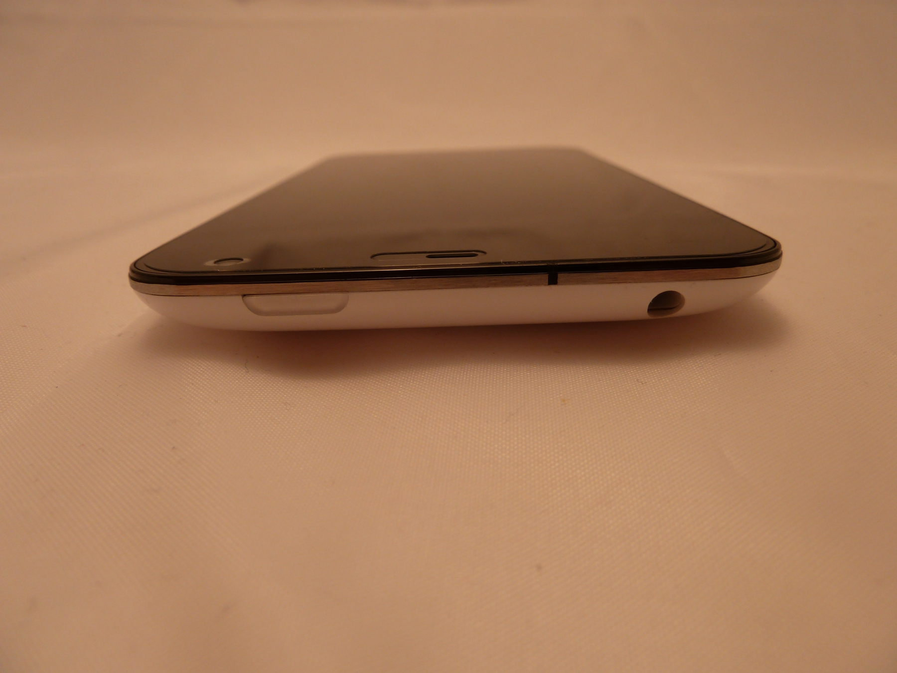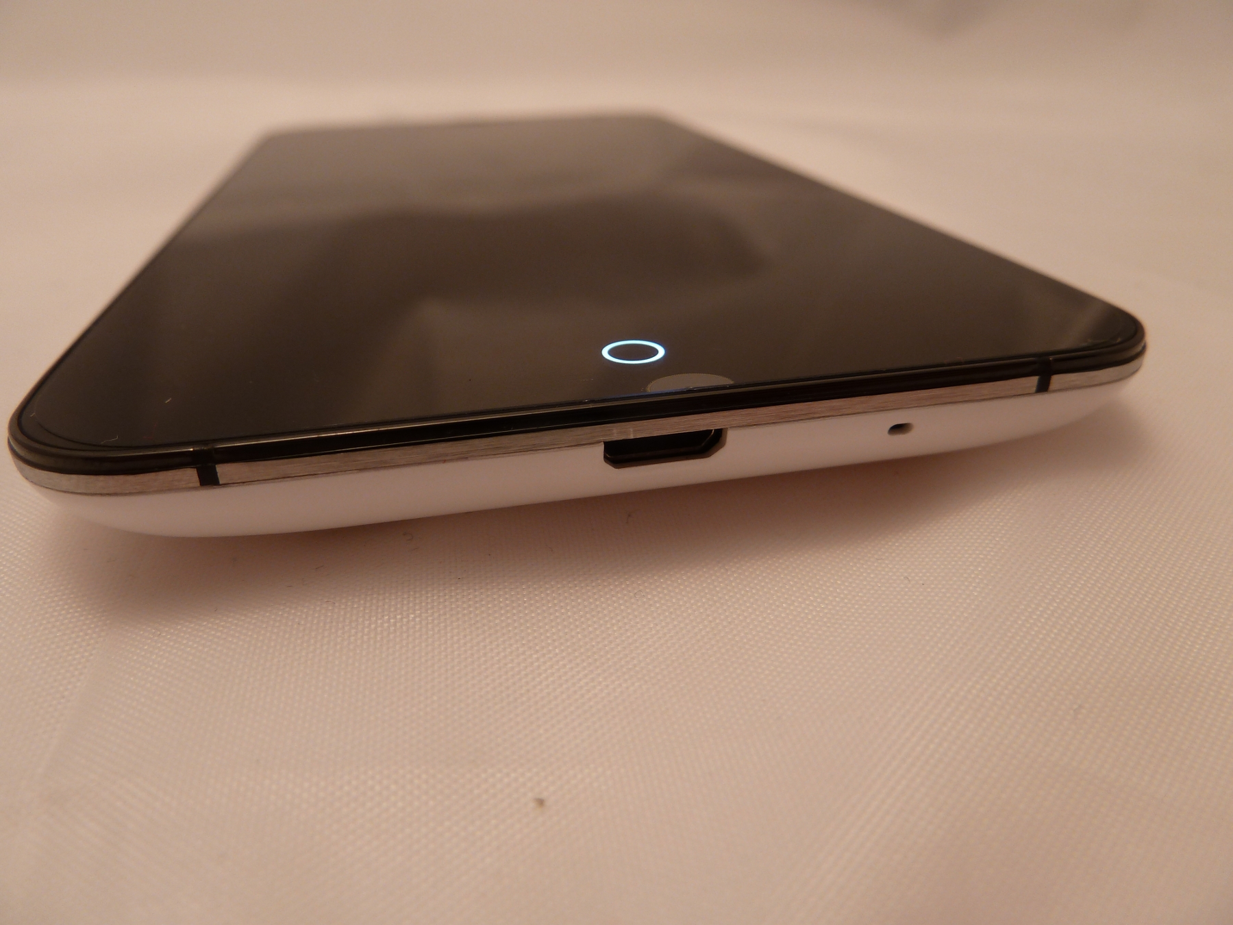 Rings um das Smartphone zieht sich ein dünner Metallrahmen, welcher zum inneren Metallgerüst des Smartphones gehört, wodurch die Stabilität erhöht werden soll. Der Rahmen dient vermutlich auch als Antenne, da bei geöffneter Rückabdeckung nur eine "Folienantenne" zu sehen ist, worauf nie im Leben alle Antennen untergebracht werden können. Auf der linken Seite des Meizu MX3 finden wir eine Lautstärkewippe, welche einen sehr guten Druckpunkt hat, und aus dem selben Material wie die Rückabdeckung besteht. Auf der Unterseite befindet sich ein Sprachmikrofon und der Micro USB Anschluss. Auf der rechten Seite finden wir nichts, auf der Oberseite den Einschaltknopf und den Kopfhöreranschluss. Dieser Anschluss ist im übrigen ganz nett gemacht, da selbst hier auf Design geachtet wurde. Es handelt sich hier nicht um eine schwarze Standardbuchse mit Metallfedern als Kontakte, sondern der Kopfhöreranschluss ist im Inneren ebenfalls weiß und als Kontakte dienen kleine Metallstifte. Es sind eben solche kleinen Details, welche das hochpreisige Segment neben der größeren Leistung ausmachen.