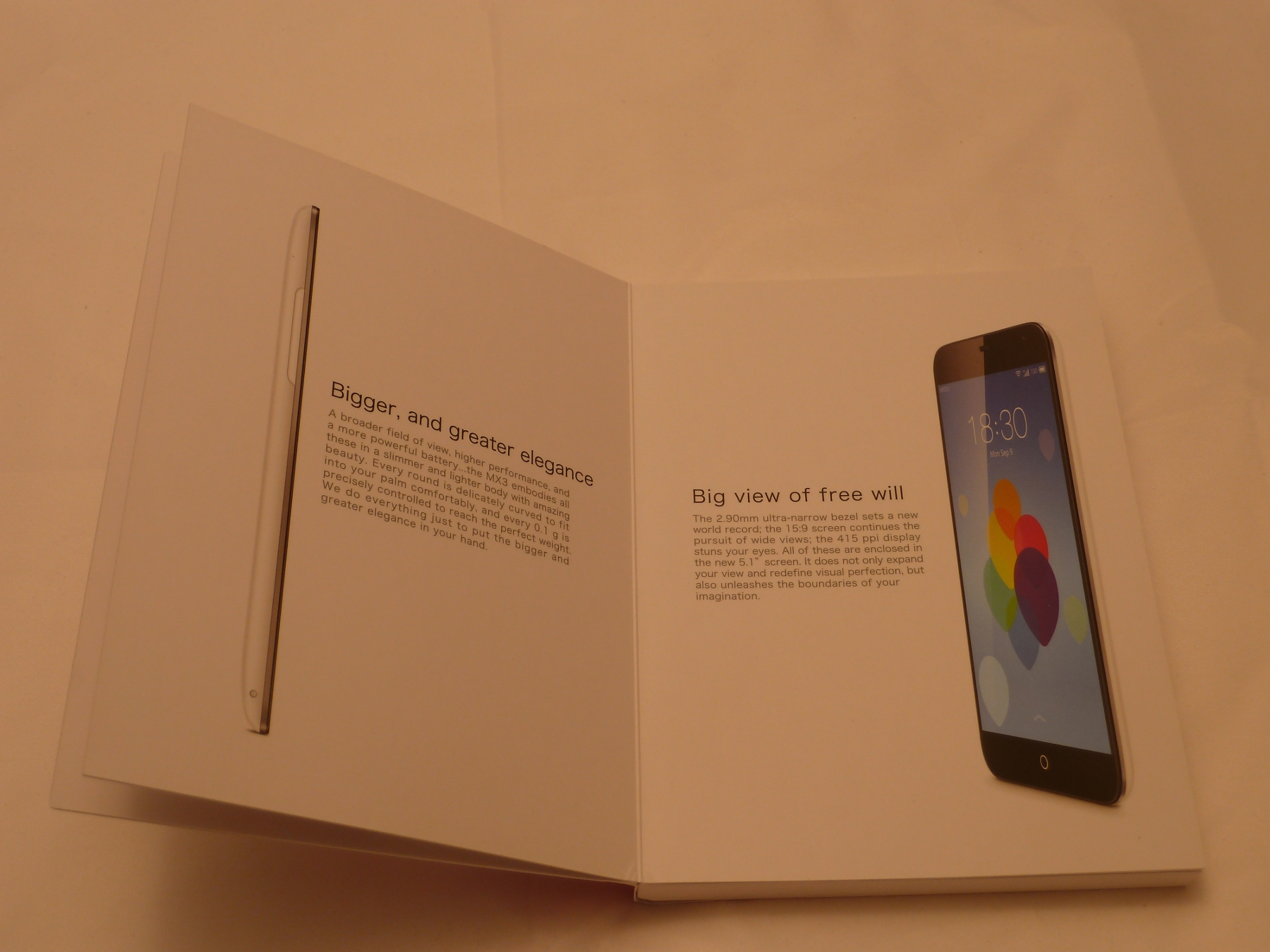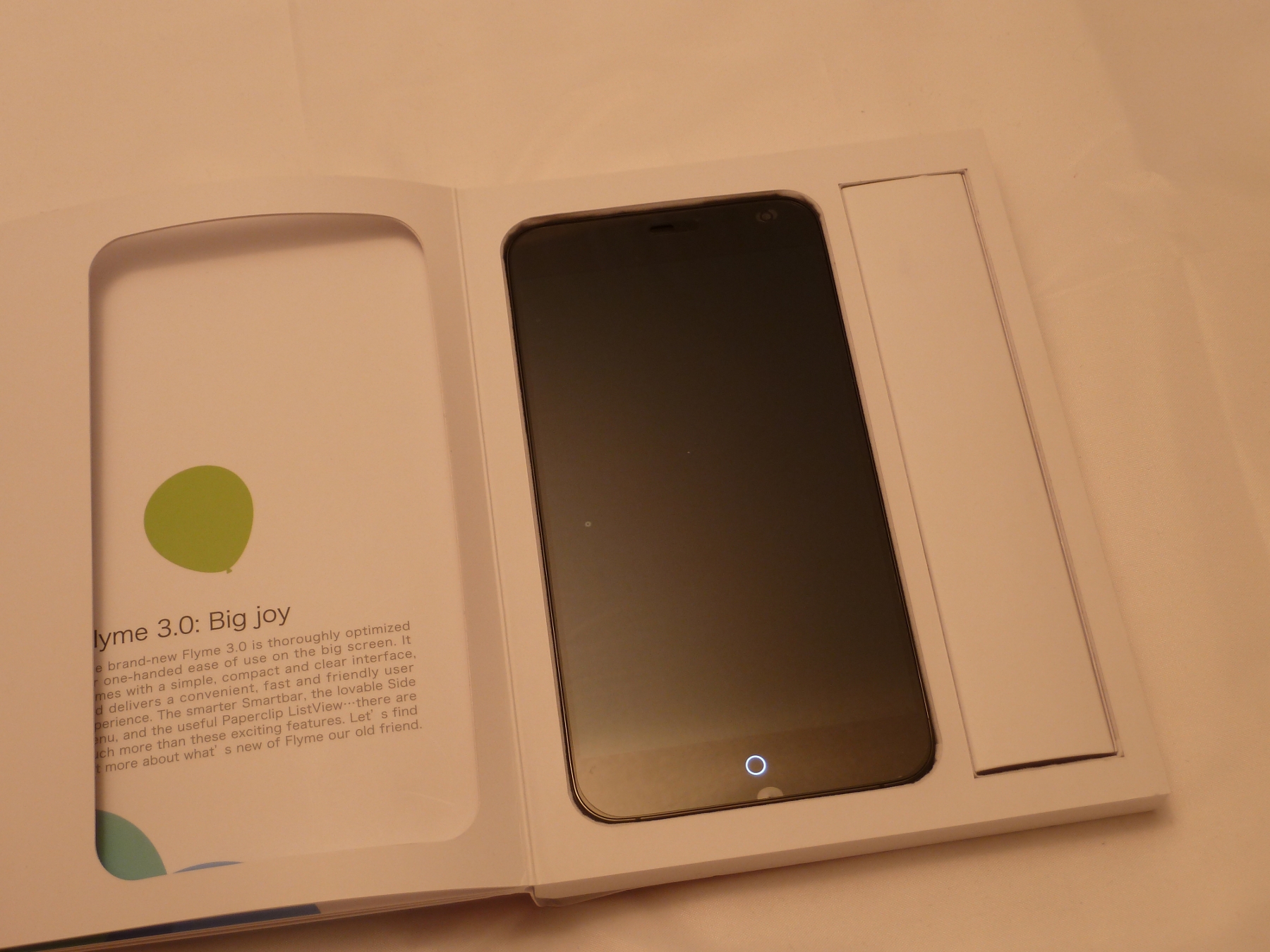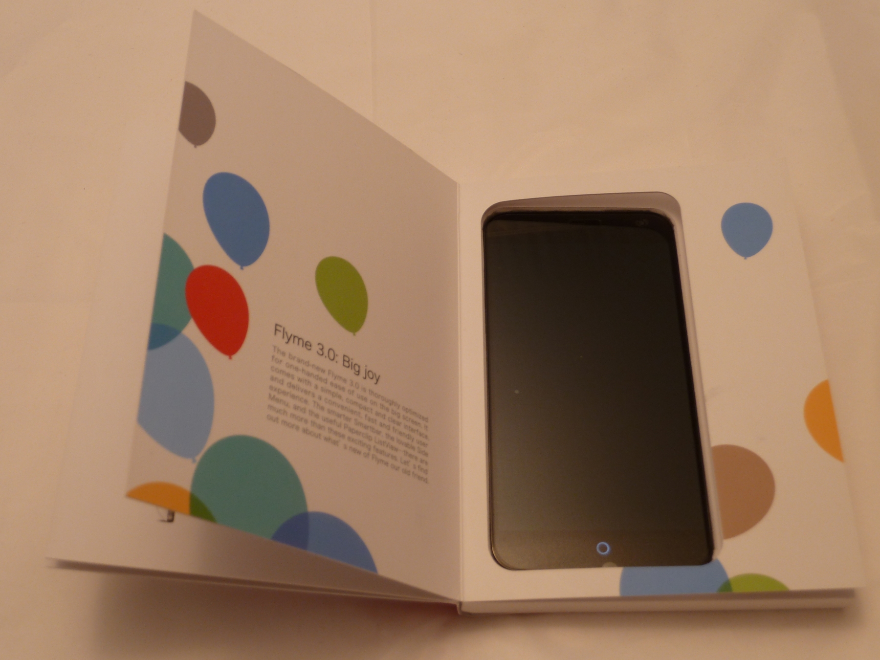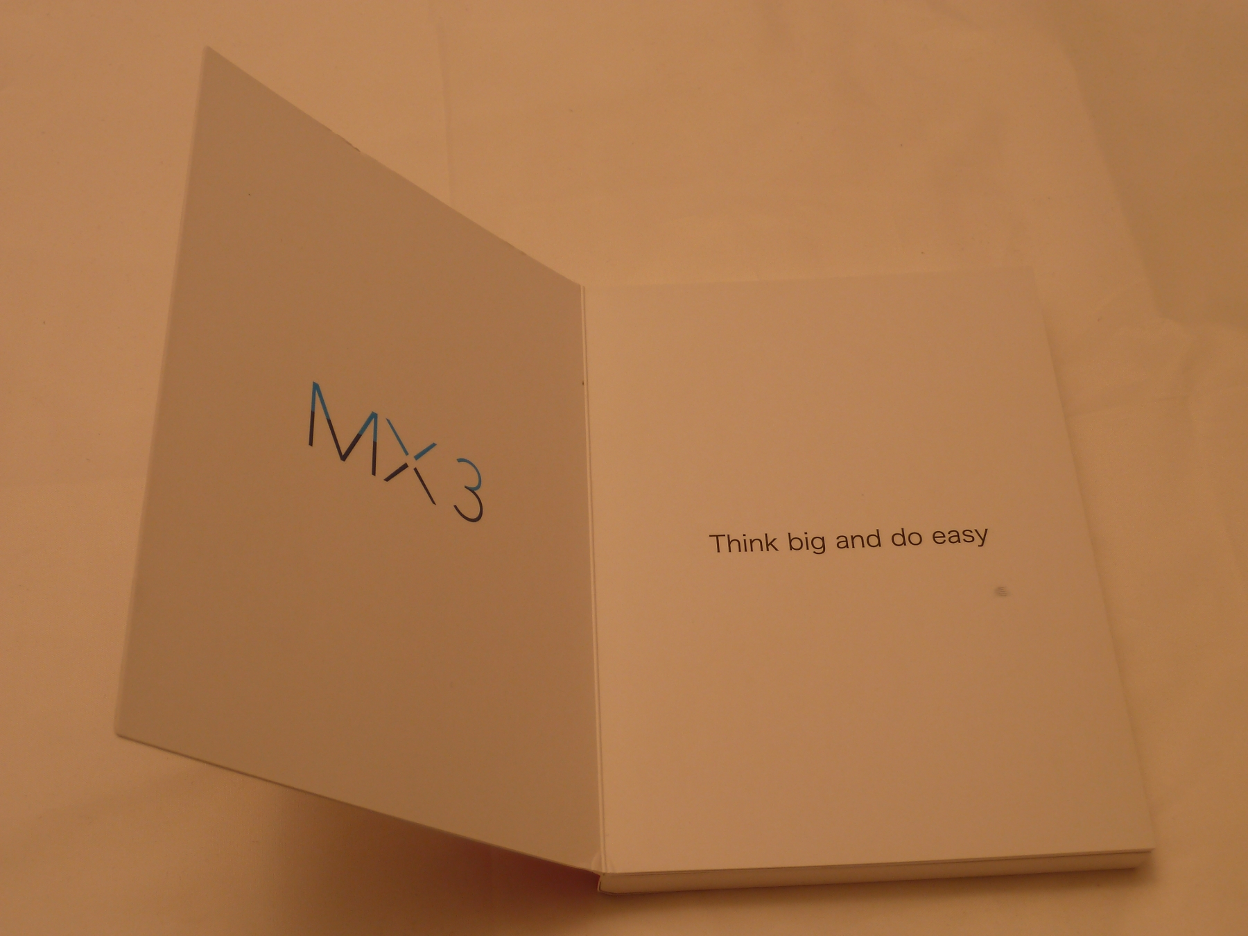 Schon beim Auspacken des Geräts merkt man, dass man hier etwas mehr Geld als üblich bezahlt hat. Anstatt eines schnöden 0815-Kartons bekommt man hier eine kleine, flache und schön designte Box, welche ganz im Stil eines kleinen Büchleins gehalten ist. Auf der Front ist groß das MX3-Logo aufgedruckt. Klappt man die Box dann auf, so wird man auf der ersten "Seite" von einem weiteren MX3 Logo begrüßt. Auf Seite zwei steht dann "Think big and do easy" auf weißem Grund. Auf den nächsten Seiten findet man dann Bilder des MX3, zusammen mit ein paar Angaben zum Design. Blättert man dann noch einmal um, so bekommt man eine kurze Information zum Flyme 3.0 ROM zu sehen, welche auf dem Gerät vorinstalliert ist. Hier bekommt man dann auch endlich das eigentliche Gerät zum ersten Mal durch ein kleines Sichtfenster zu sehen.