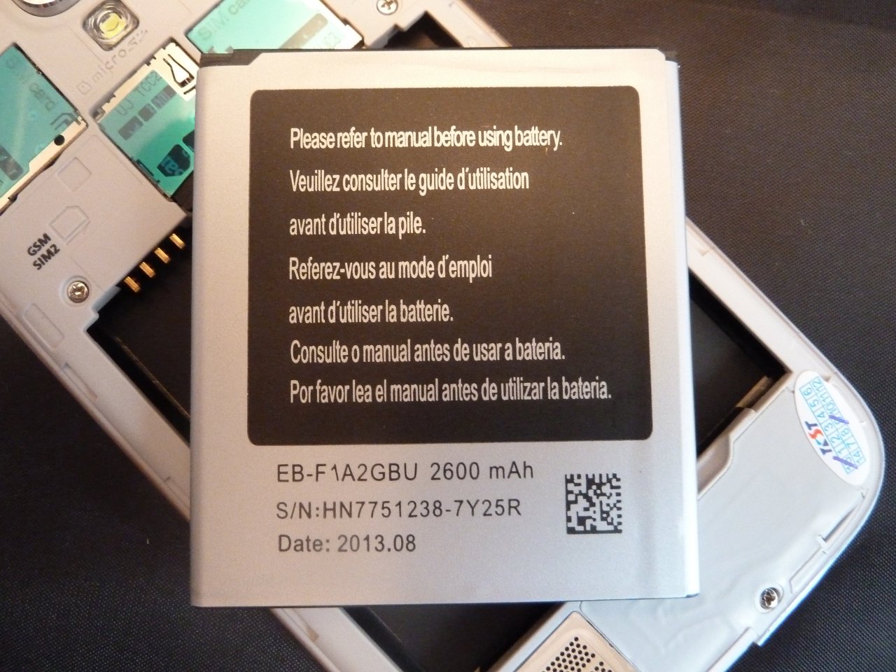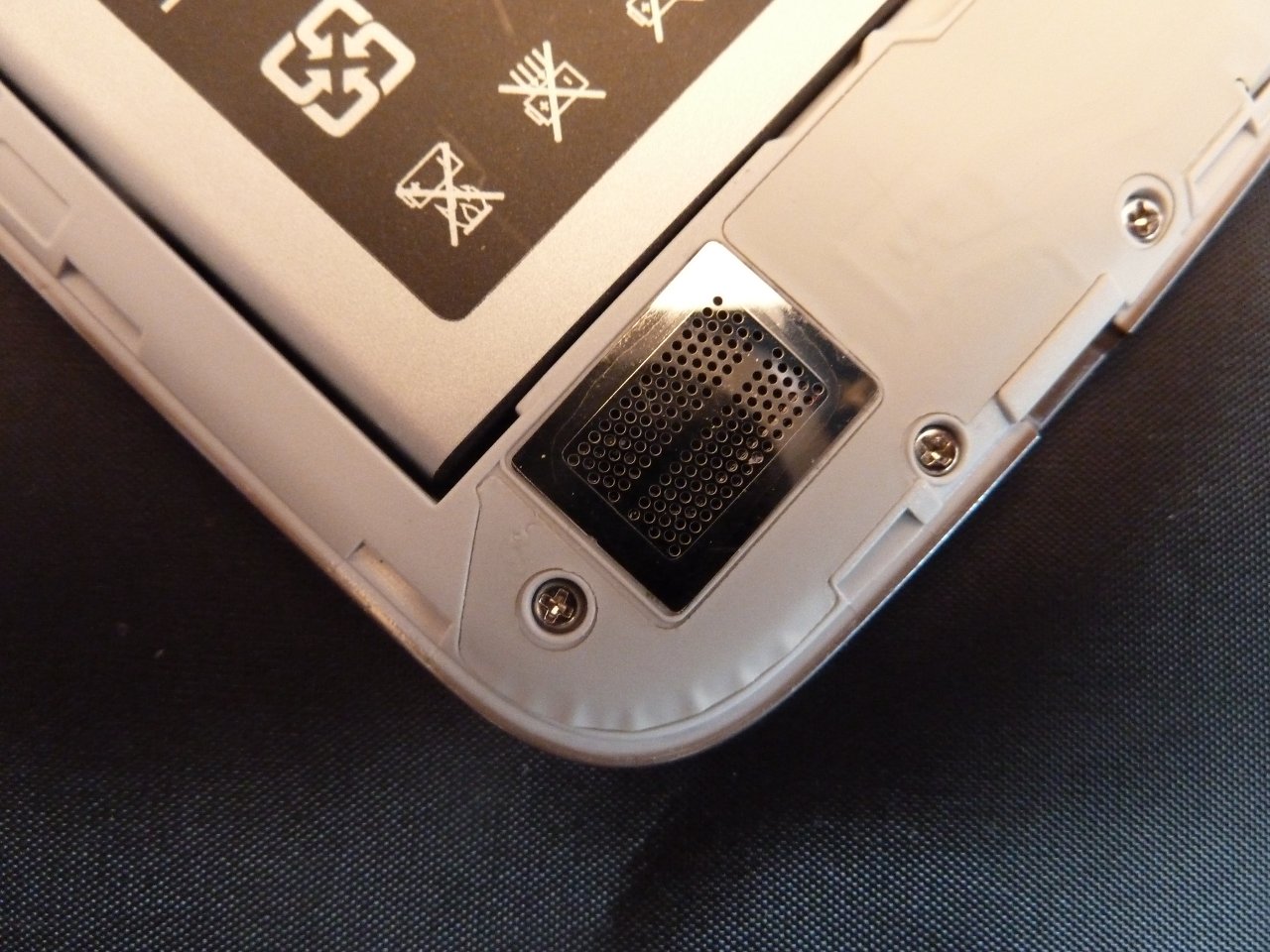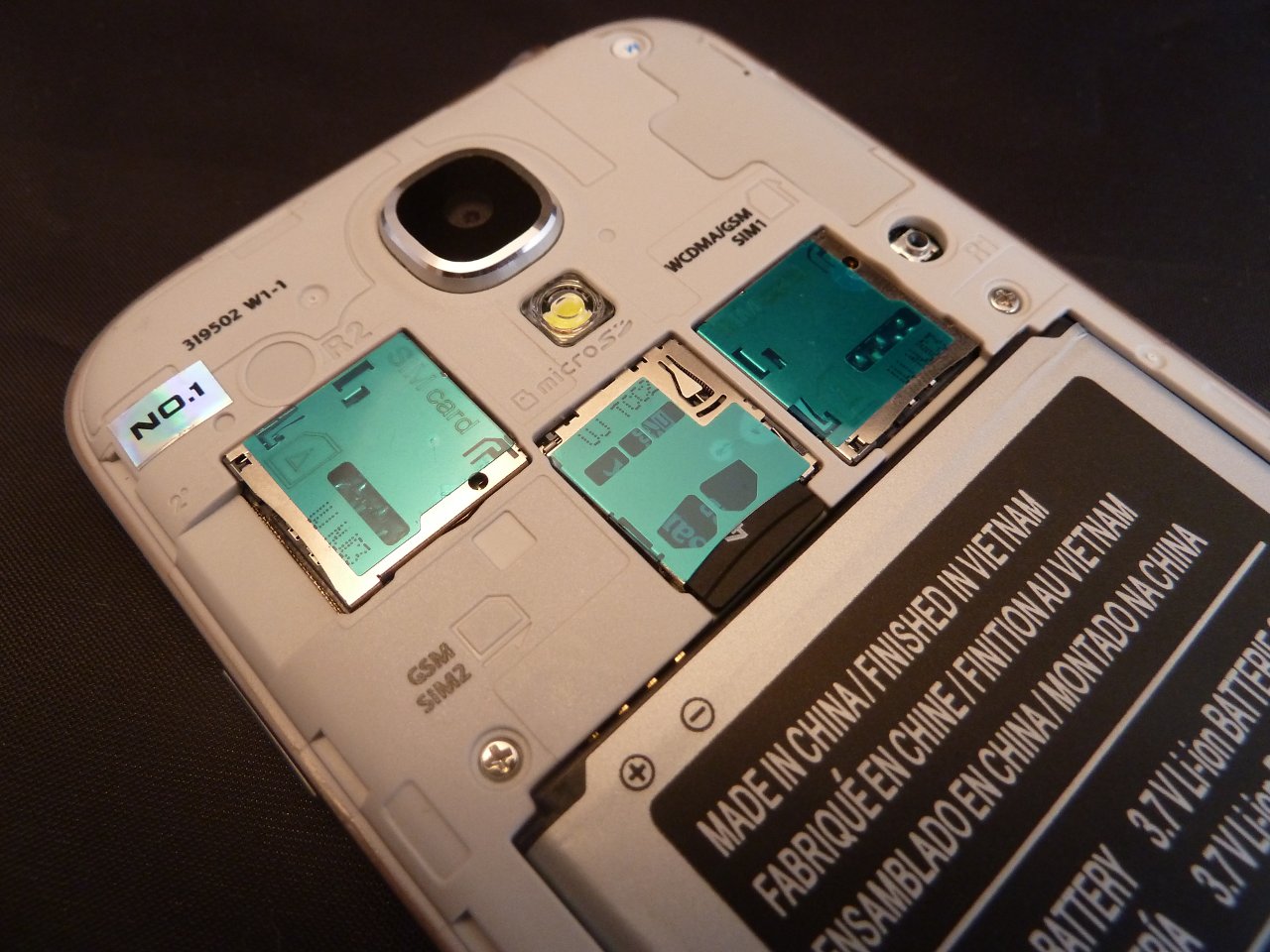 Öffnet man die Rückabdeckung des No.1 S6, so sieht man zwei Slots für Micro SIM Karten, sowie einen Slot für eine Micro SD Karte. Darunter befindet sich das Fach für den Akku. Am unteren Rand befindet sich der Lautsprecher des Geräts.