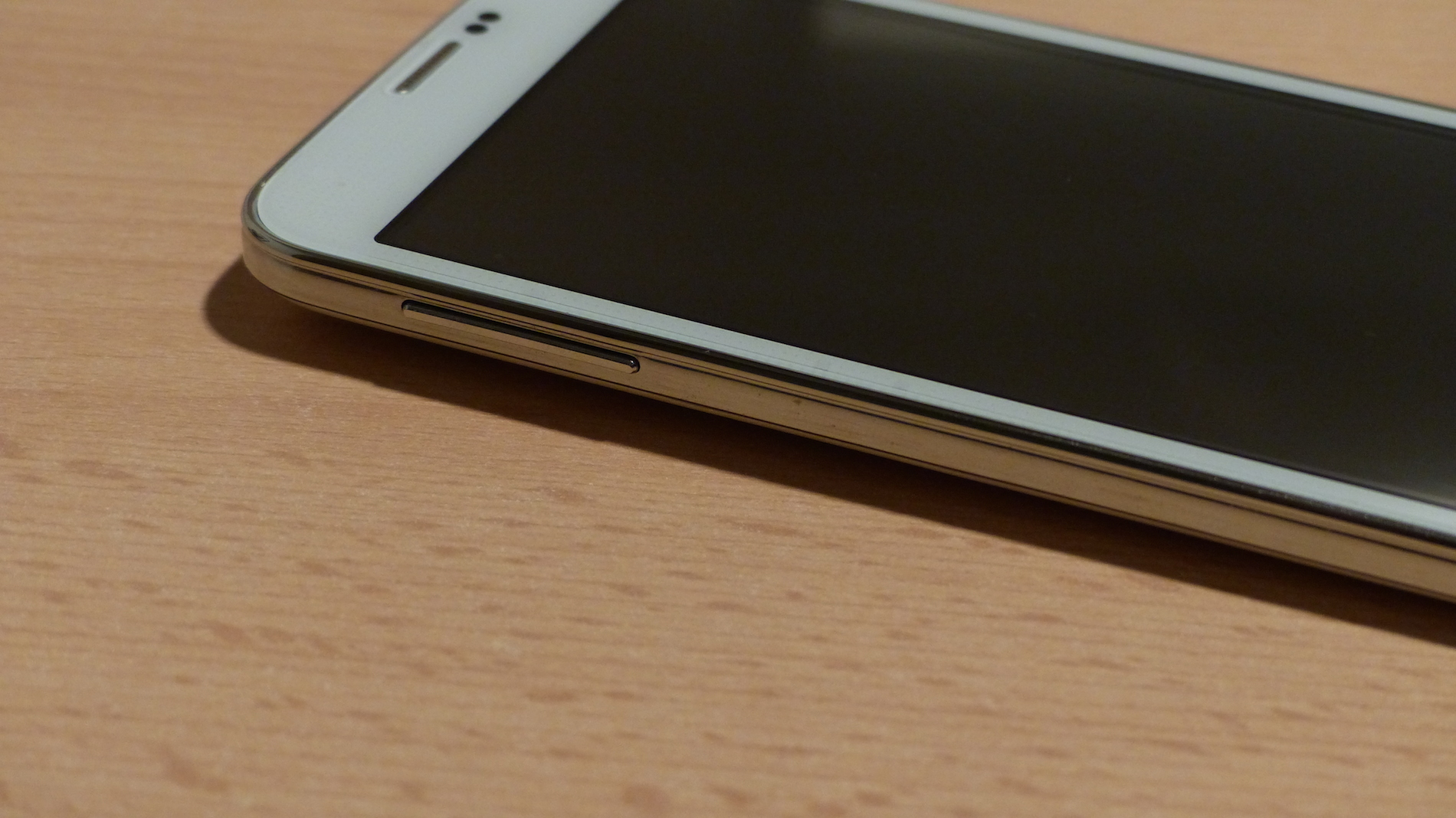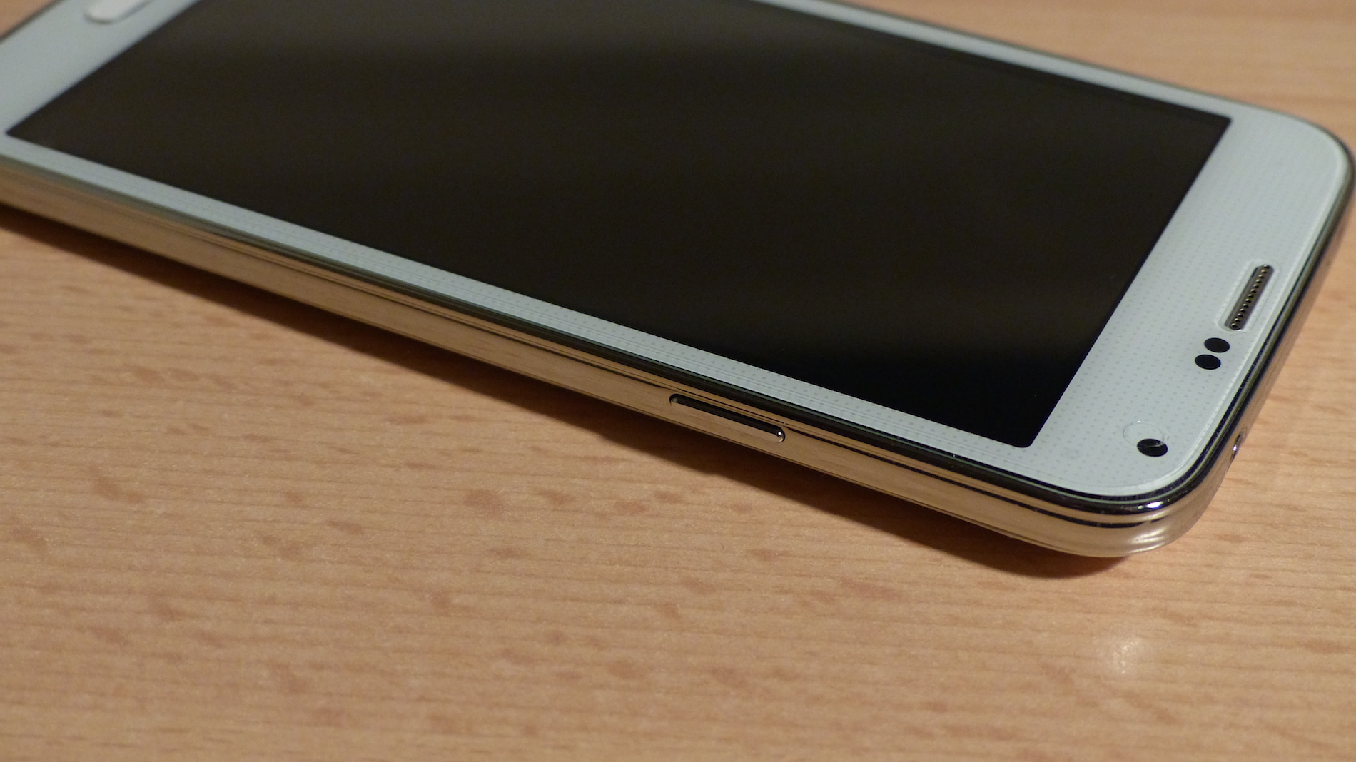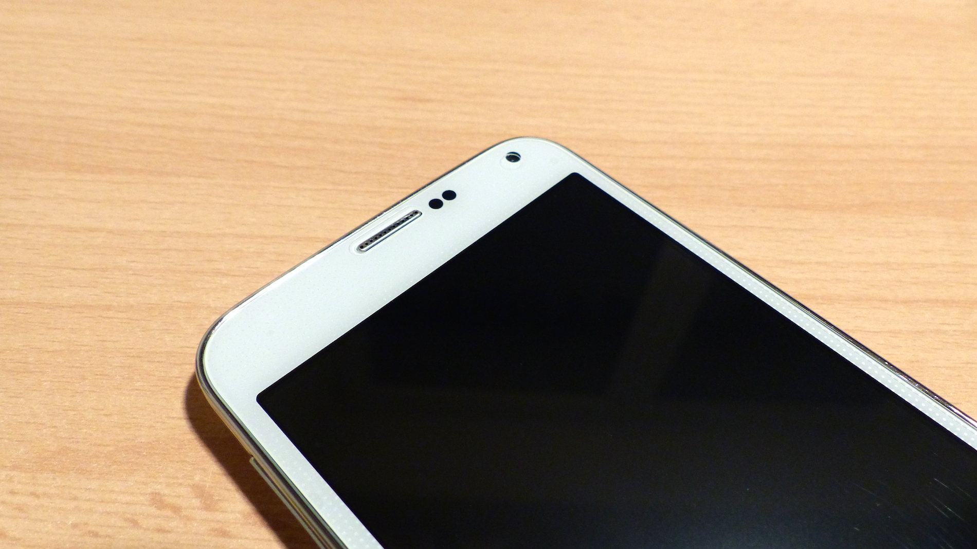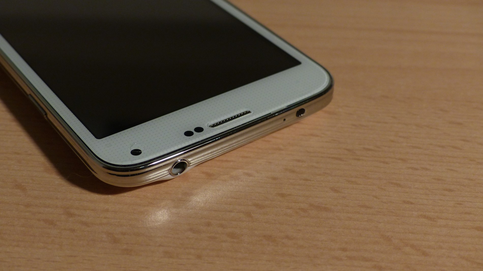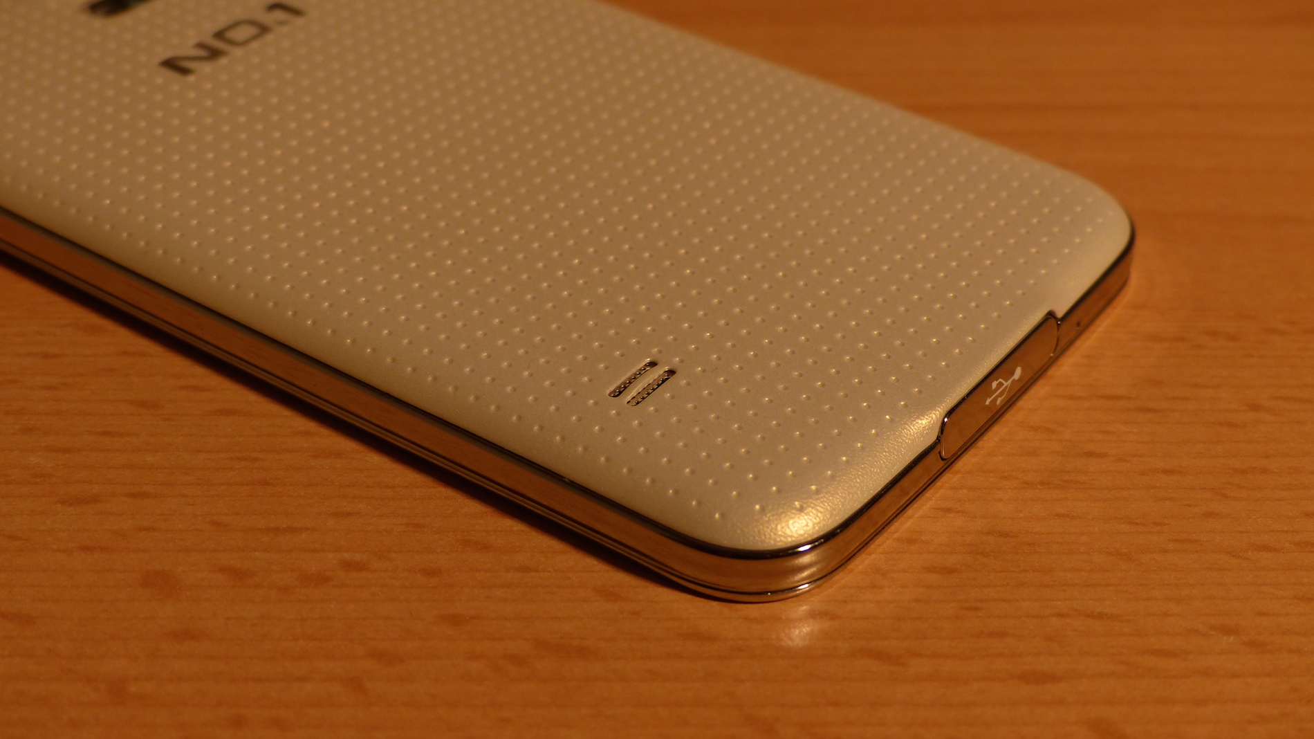 Designtechnisch ist das No.1 S7 wirklich eine sehr exakte Kopie des Samsung Galaxy S5 und erst auf den zweiten Blick vom Original durch die fehlenden Samsung Logos zu unterscheiden. Beim weißen Modell, welches und zum Test vorlag, ist die gesamte Front ebenfalls in Weiß gehalten und mit einem leichten Muster versehen. Auf der Oberseite finden wir hier eine Status LED, welche nur sichtbar ist wenn sie leuchtet, einen Telefonhörer, zwei Sensor-Öffnungen und die Frontkamera. Unter dem Display fällt sofort der typische physikalische Home Button auf. Die zwei Soft Buttons daneben sind nur sichtbar, wenn diese beleuchtet sind.