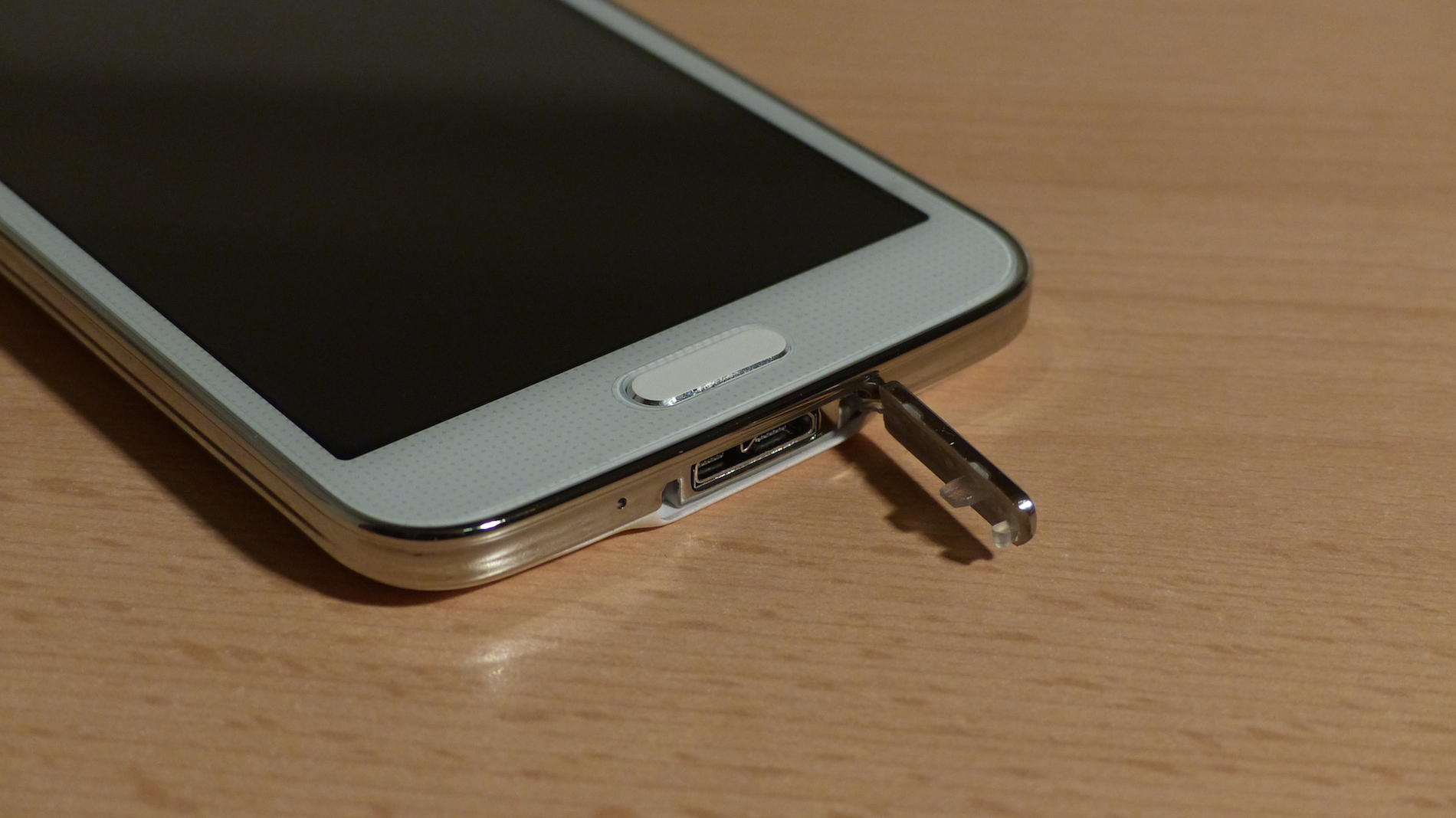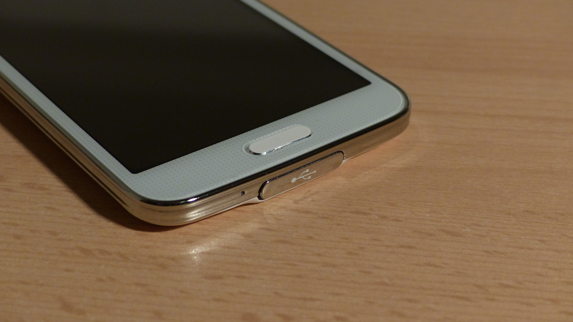 Von den Seiten betrachtet, fällt sofort der silberne Rahmen um das Gerät auf, welcher leicht geriffelt ist und ein wenig an den vom Note 3 erinnert. Dieser ist hier aus Plastik und nicht aus Metall. Hier finden wir auf der linken Seite eine Lautstärkewippe, sowie auf der unteren Seite das Sprachmikrofon und eine Klappe, unter welcher sich ein USB 3.0 Anschluss verbirgt. An diesen passt natürlich auch ein normales Micro USB Kabel und es wird OTG unterstützt. Leider lässt sich die Klappe zu Beginn nur sehr schwer wieder schließen, was sich aber nach einer Weile legt.