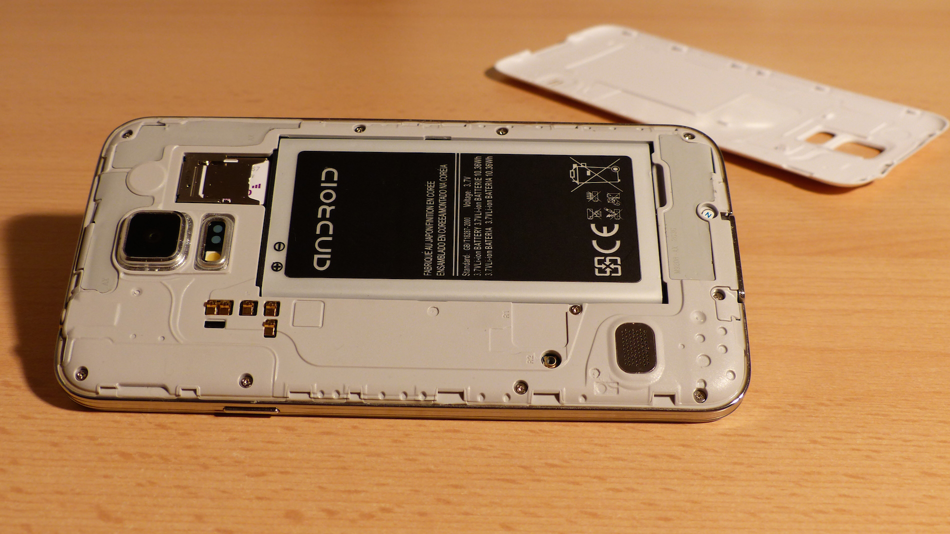 Das Backcover ist schnell entfernt, und gibt den Blick auf übereinander angeordnete Slots für eine Micro SD Karte und eine Micro SIM Karte, den Akku, Kontakte für das Samsung Wireless Charging FlipCover und den Medienlautsprecher frei. Ob Wireless Charging damit wirklich funktioniert können wir mangels Cover nicht sagen, es sieht aber ganz danach aus. Eventuell kann das ja mal jemand testen und dann einen Kommentar schreiben.