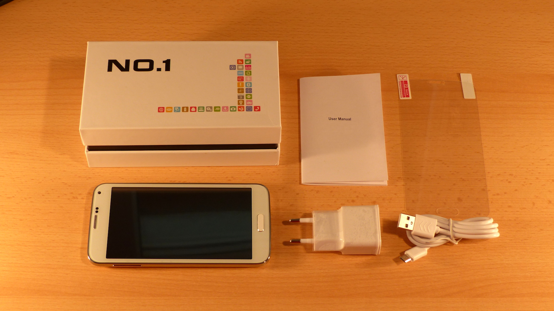 Geliefert wird das No.1 S7 im typischen No.1 Karton, welchen wir ja schon von den bisher getesteten No.1 Geräten kennen. Hier befindet sich das No.1 Logo auf der Oberseite, sonst befinden sich dort keine Informationen. Im Karton befinden sich dann neben dem Smartphone ein Ladegerät mit deutschem Stecker welches vom CECT-Shop beigelegt wurde, ein Micro USB Kabel in Weiß, eine Schutzfolie für den Bildschirm und eine Anleitung in englischer Sprache. No.1 folgt dem aktuellen Trend und verzichtet auf die Beigabe von Kopfhörern.