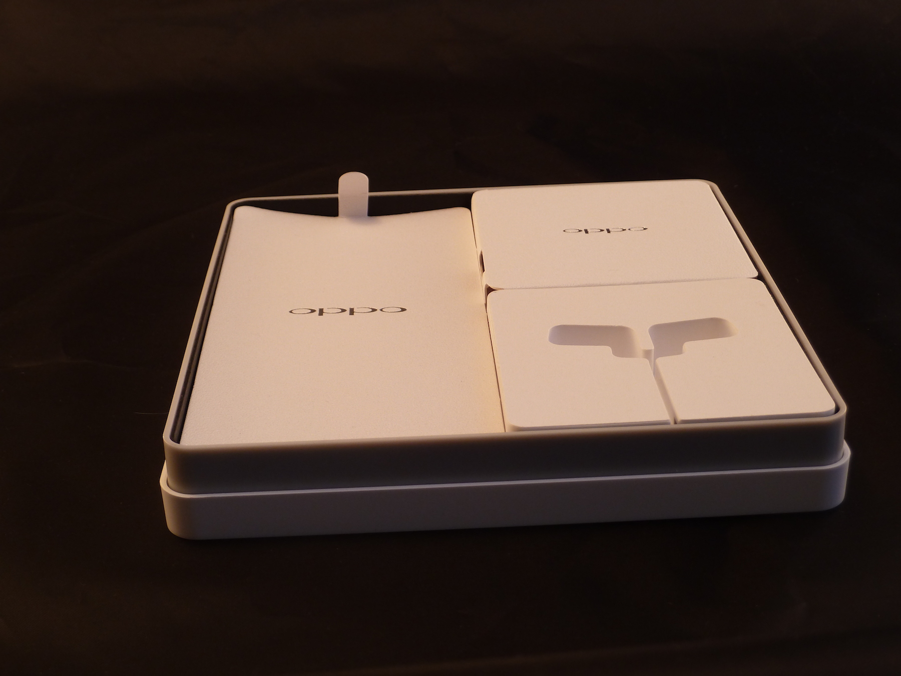 Öffnet man die große Polycarbonatbox, so lächelt einen der sorgfältig geordnete Inhalt an. Links befindet sich das Smartphone, rechts oben eine Box mit dem USB Kabel und dem Original-Netzteil (lustigerweise auch mit deutschem Stecker) und rechts unten dann ein kleiner Würfel auf dem der mitgelieferte Kopfhörer aufgewickelt ist. Nimmt man dann noch das mit Oppo beschriftete Papierstück ab, auf dem das Smartphone gelegen hat, so findet man einen kleinen Papierumschlag. Klappt man diesen auf, so findet man zunächst einmal das SIM Werkzeug in from eines "Oppo O's" vor. Klappt man weiter auf, so kommen zwei Dokumente zum Vorschein: Eine Kurzanleitung und ein Heft mit wichtigen Hinweisen.