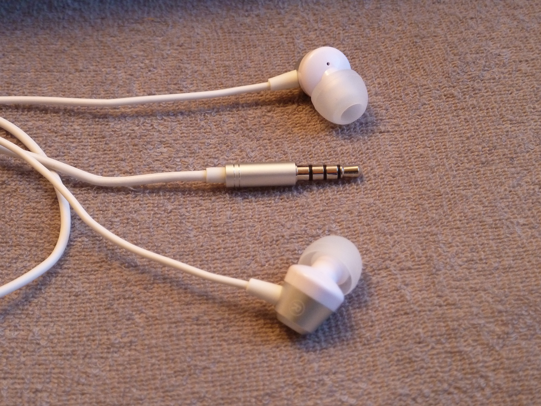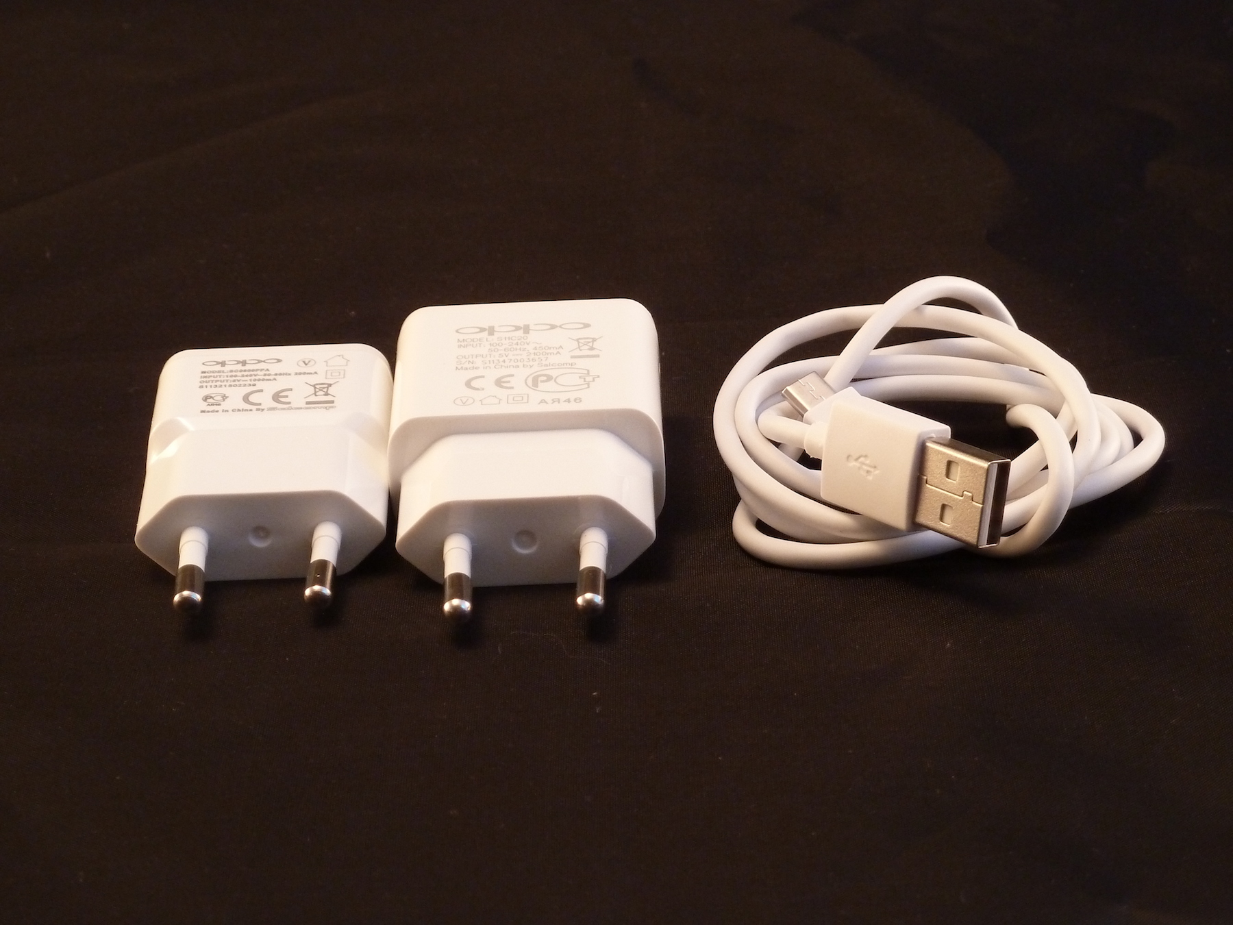 Weiter geht es mit den beiden Netzteilen. OppoStyle liefert hier für die Deutschen ein eigenes kleines Netzteil mit, welches mit CE Zeichen ausgestattet ist. Im Grunde ist das überflüssig, denn auf das originale Netzteil trifft dies auch zu. Dieses ist allerdings etwas größer. Somit kann der Kunde also entscheiden welches er letztendlich verwenden will. Beim mitgelieferten Micro USB Kabel handelt es sich um ein ganz normales weißes Kabel. Der mitgelieferte Kopfhörer ist sehr hochwertig verarbeitet. Stecker und Hörer bestehen zum Großteil aus Aluminium. Außerdem sind die Hörer leicht gebogen, wo mit sie direkt in den Gehörgang gleiten und somit optimal sitzen und für gute Schalldichte sorgen. Eine kleine Rufannahmetaste ist auch eingebaut. Der Klang der Kopfhörer ist wirklich sehr gut. Sie klingen sehr klar, laut und haben eine äußerst gute Basswiedergabe. Man könnte sie mit einem Wort bewerten: Bäääm!