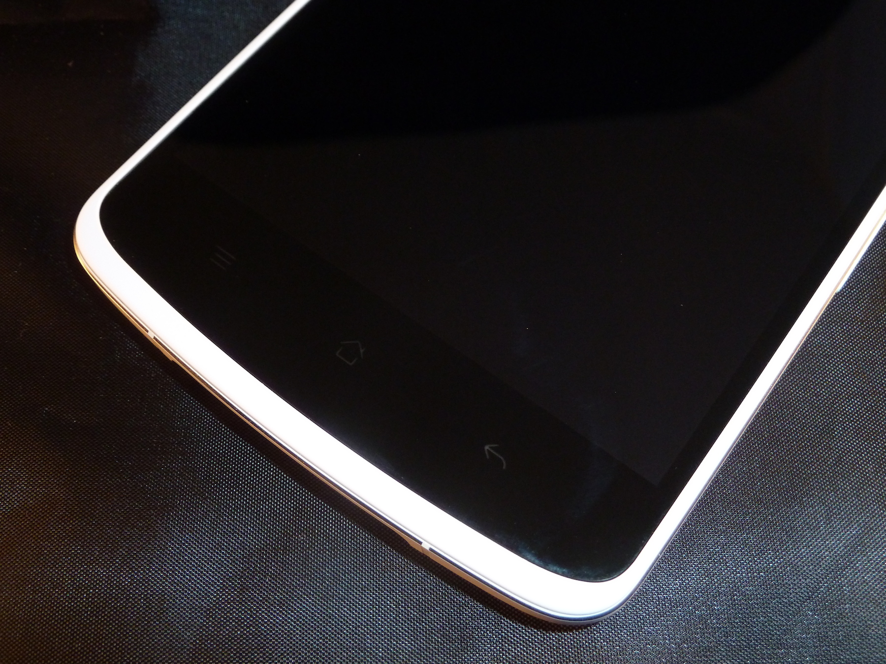 Das Design des Oppo N1 wirkt sehr aufgeräumt. Auf der Oberseite finden wir hier den Hörer, den Helligkeitssensor und einen Annäherungssensor. Diese sind in das rotierbare Kameramodul eingebaut. Darunter befindet sich dann der große 5,9" Bildschirm, welcher noch einmal von einem dünnen schwarzen Rahmen umfasst ist. Der Bildschirm ist etwas tiefer als der Rest des Gehäuses, was eine versehentliche Bedienung verhindert, da man genau spürt wo das Gehäuse endet und der Bildschirm beginnt. Eine sehr schöne Idee wie wir finden. Auf der unteren Hälfte befinden sich dann nur noch die üblichen Soft-Buttons. Diese sind hier in Blau beleuchtet. Gut gefallen haben uns am Design die leichte Rundung auf der oberen und unteren Seite. Das ganze sieht einfach viel eleganter und hochwertiger aus, als das klassische quadratische Smartphonedesign.