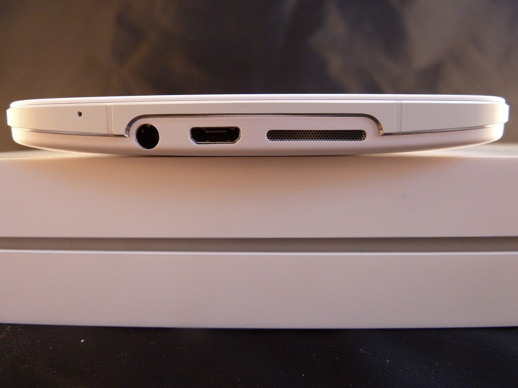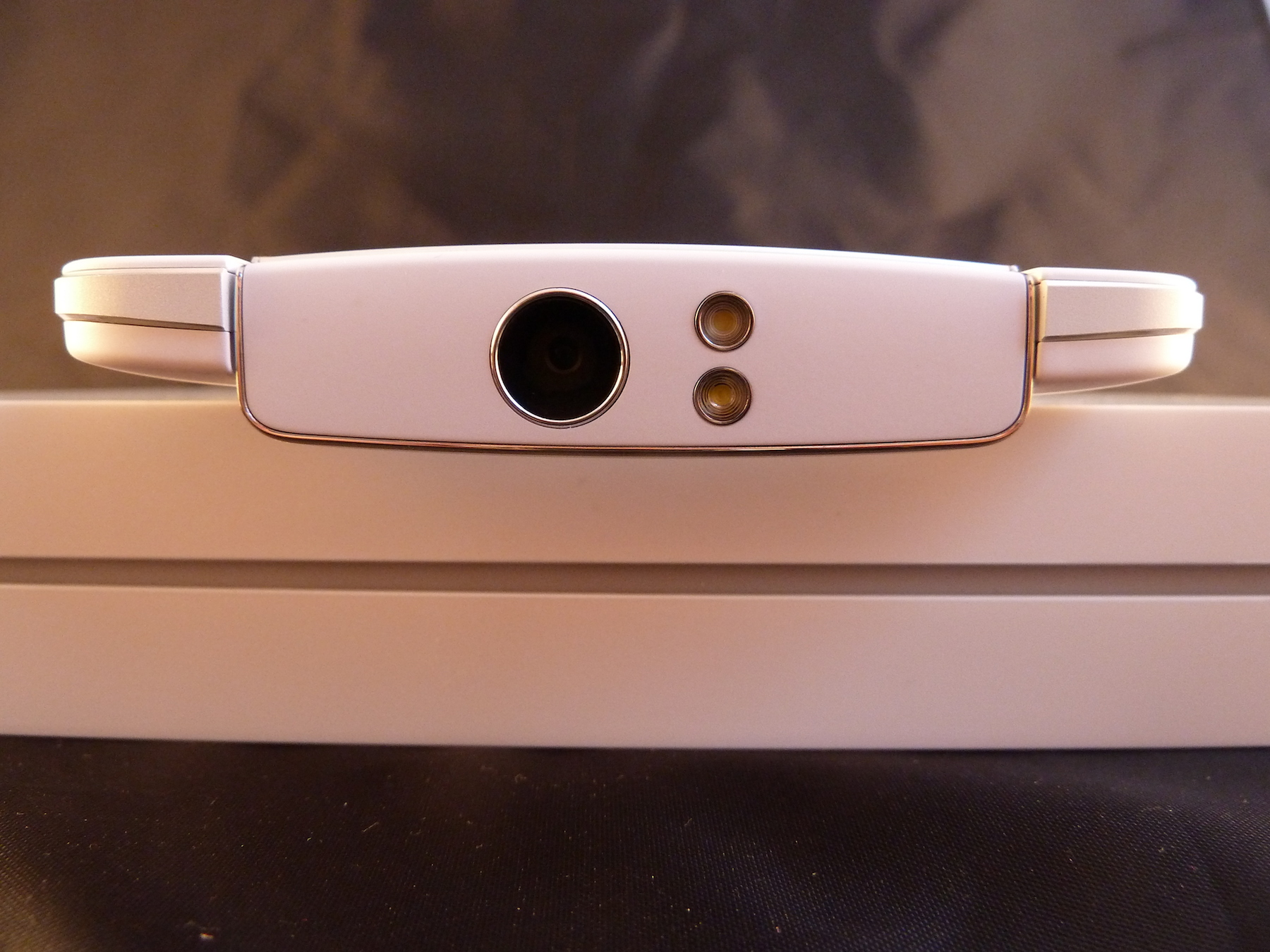 Um das Smartphone herum führt dann noch ein kleiner Metallrahmen. Dieser ist auf der Oberseite auch weiß lackiert, die Kanten sind allerdings unlackiert und glänzend. Dies setzt einen schönen Akzent. Dieser Rahmen dient anscheinend auch als Antenne. Auf der linken Seite befindet sich außerdem der Slot für eine Micro SIM Karte, auf der unteren Seite das Sprachmikrofon, der Kopfhöreranschluss, der Micro USB Port und der Lautsprecher, rechts befinden sich eine Lautstärkewippe und der Ein/Aus-Schalter. Oben befindet sich im Normalfall nichts, man kann aber die Kamera so drehen, dass sie in diese Richtung zeigt.