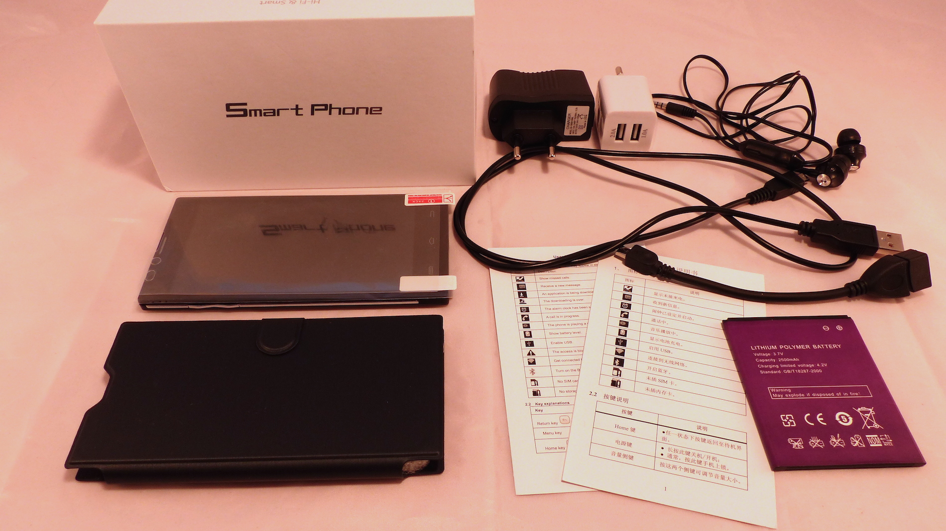 Lobenswert ist, wie viel Zubehör hier mal wieder beiliegt. Da spielt Star ja bekanntlich immer ganz vorne mit. Hier finden wir eine Displayschutzfolie, auf dem Gerät ist hier allerdings ab Werk keine Folie aufgebracht. Dann finden wir ein schwarzes Netzteil mit deutschem Stecker, was die Verwendung eines Adapters unnötig macht. Das Netzteil macht übrigens einen sehr hochwertigen Eindruck, was man bekanntlich nicht von allen Netzteilen aus China behaupten kann. Dann liegt noch ein schwarzes Micro USB Kabel bei, sowie zwei 2.500mAh Akkus, von denen Einer bereits im Smartphone verbaut ist. Außerdem gibt es noch ein schwarzes Flipcover mit Magnetverschluss, welches per Klebestreifen am Smartphone befestigt wird. Zwei Anleitungen in Englisch und Chinesisch liegen auch bei, welcher aber nicht gerade nützlich sind, da nicht besonders ausführlich. Die Kopfhörer taugen wie so oft nur als Freisprecheinrichtung und sind zum Musik hören zu schlecht.