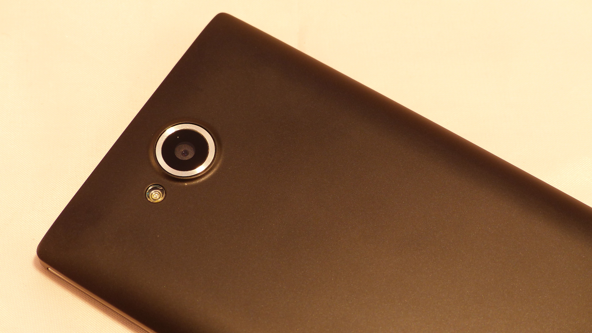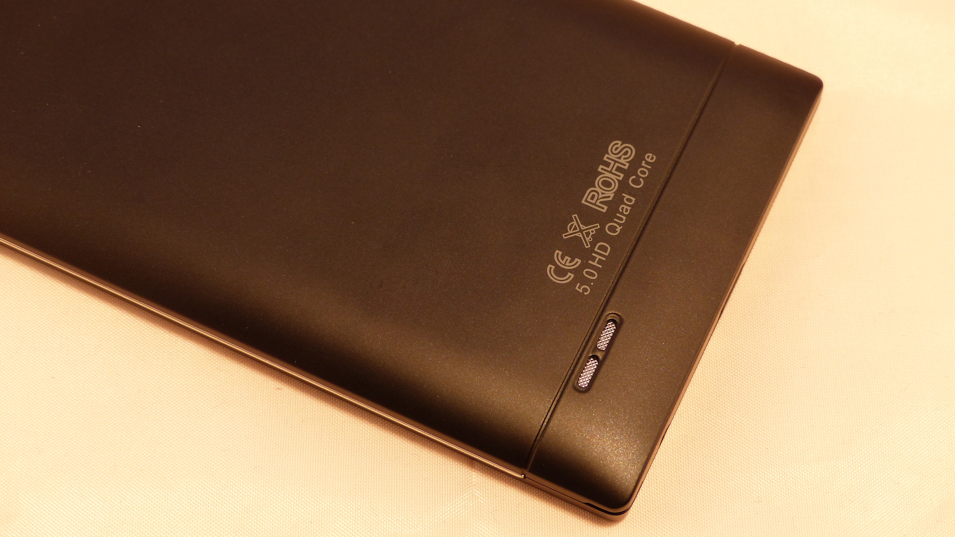 Drehen wir das Smartphone um, so finden wir auf der oberen Hälfte die Rückkamera, welche in einem kleinen Metallring eingefasst ist. Links daneben befindet sich der LED Blitz. Auf der unteren Hälfte befinden sich ein CE und RoHS Symbol, sowie die Öffnung für den Lautsprecher. Hier ist auch eine kleine Rille zu sehen, welche keine Funktion hat, sondern einfach nur als Designelement dient.