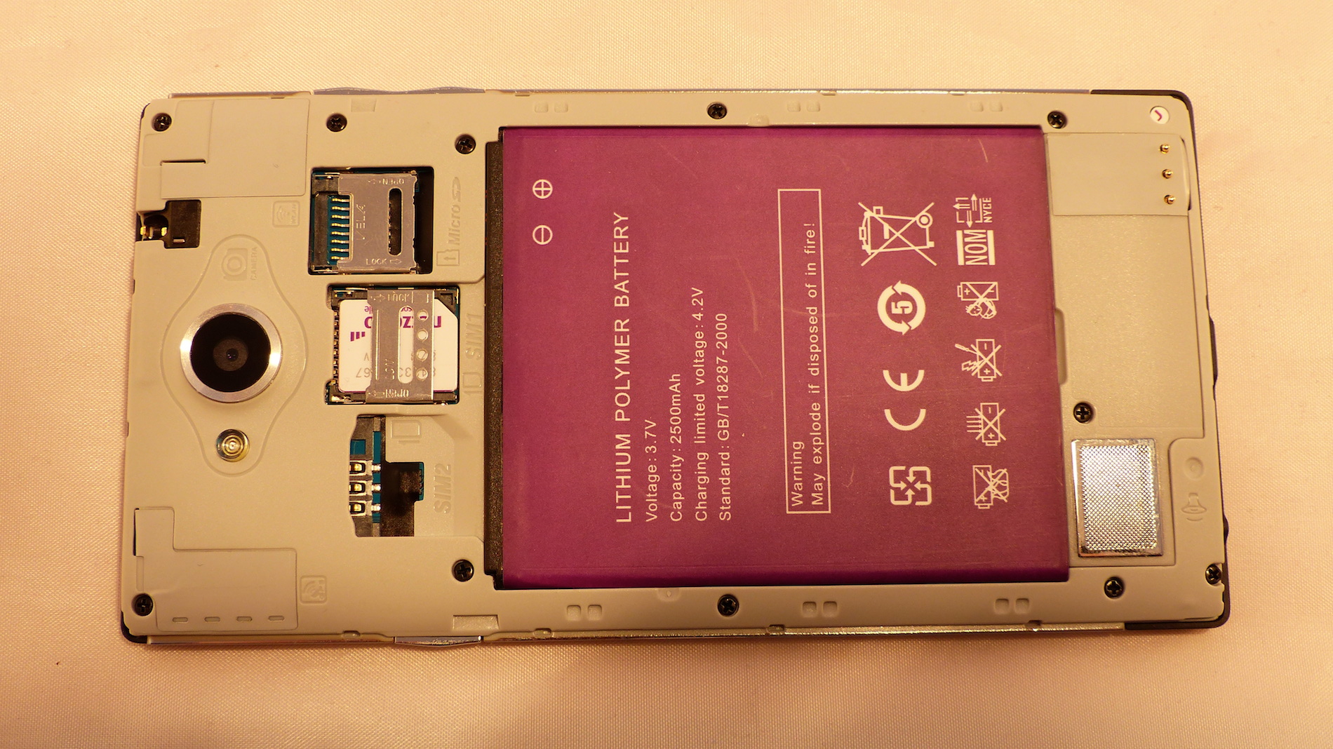 Nimmt man die Rückabdeckung ab, so sieht man sofort die beiden SIM Einschübe, sowie einen Slot für eine Micro SD Karte. Darunter befindet sich dann das Akkufach, und darunter wiederum der Multimedia Lautsprecher des Geräts, welcher überraschend groß ist damit schon im Vorfeld einen recht guten klang verspricht. Hier unten finden wir auch 3 Antennenkontakte, nicht etwa für eine NFC Antenne, sondern für eine 2G / 3G Antenne, welche sich hier im Backcover befindet. Das ist etwas, das wir bisher noch nicht gesehen haben, aber eine durchaus interessante Lösung.