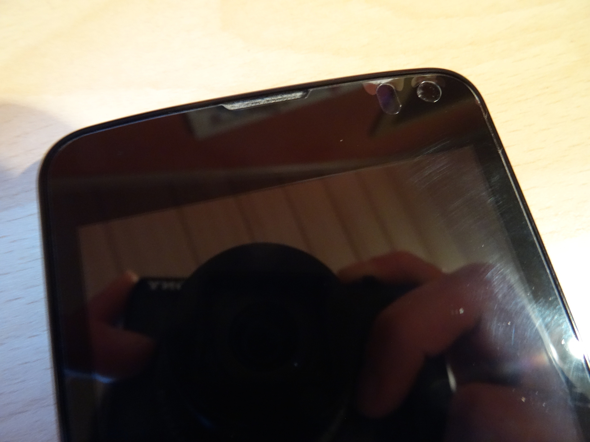 Das Smartphone selbst ist in der typischen, dünnen Kunststofffolie eingehüllt. Der Akku ist schon eingelegt und man kann es direkt anschalten. Auf dem Display ist sogar eine Displayschutzfolie aufgebracht, die in meinem Fall aber nicht wirklich sauber sitzt. In der oberen rechten Ecke bei der Kamera und dem Helligkeitssensor sind deutliche Blasen zu sehen, die den sonst so schicken Look des Gerätes trüben. Wahrscheinlich ist dies aber nur ein Einzelfall und nicht generell so.