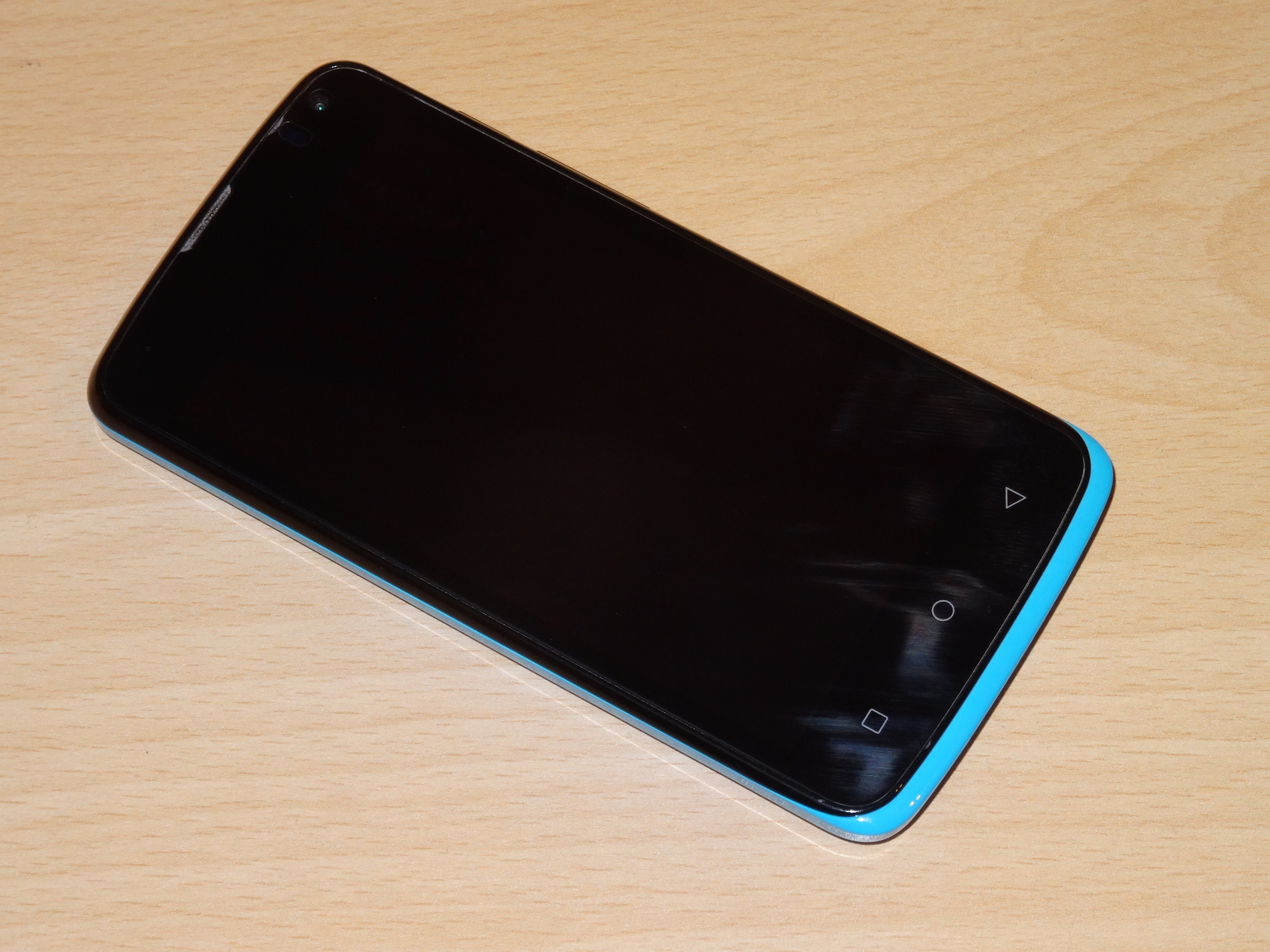 Die Front ist schwarz, bekommt an der Unterseite aber abhängig von der Wahl des Backcovers einen farblichen Akzent. Dort stülpt sich dieses nämlich etwas auf die Front über und die abgerundeten Kanten wirken sehr weich und jugendlich. Die Sensortasten unterhalb des Bildschirms sind klar geformt und haben die Form eines Quadrats, eines Kreises und eines Dreiecks. Damit bleibt man der Android Formgebung treu. Leider sind diese Tasten aber nicht hintergrundbeleuchtet, was das Finden derer in der Dunkelheit natürlich deutlich erschwert. Bei Licht sind sie aber aufgrund der hellen Farbe gut erkennbar. Am oberen Rand des Displays befindet sich der Ohrhörer für Telefonate, der tiefer sitzt und gut aussieht. Leider ist er aber aufgrund dieser Vertiefung ein ziemlicher Schmutz- und Staubfänger und sieht nach kurzer Zeit schon etwas dreckig aus. Rechts davon befinden sich die Sensoren für Helligkeit und Annäherung und nochmals weiter rechts davon die Frontkamera, die mit 2 Megapixeln auflöst. Die Displayränder des Elephone G2 sind leider ziemlich breit, was das Gerät unnötig groß werden lässt.