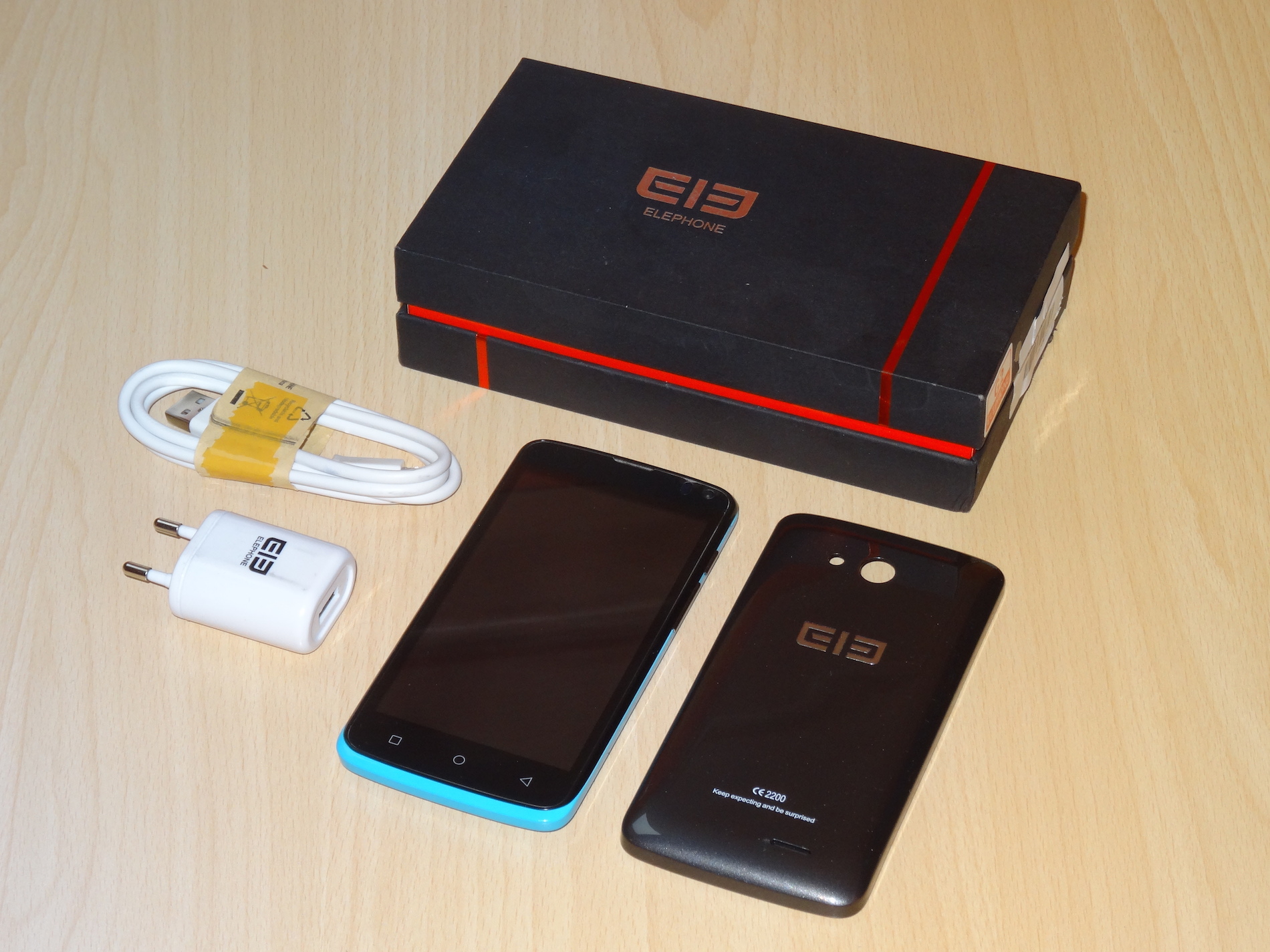 Beim Design der Verpackung bleibt Elephone seiner Linie treu. Eine schwarze Box mit roten Akzenten, die außer dem Elephone-Logo und dem Slogan „keep expecting and be surprised“ nichts trägt. Hebt man Deckel ab, kann man direkt das Smartphone heraus holen, das oben auf liegt. Darunter befinden sich in separaten Bereichen ein Micro USB-Kabel und ein Netzteil mit EU-Stecker.