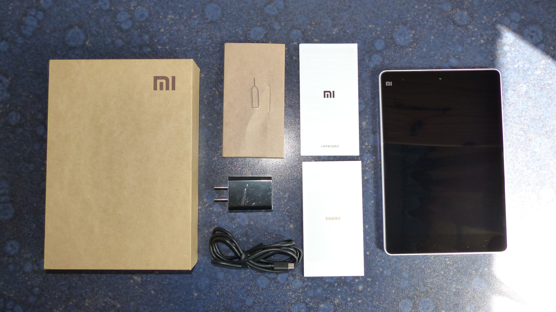 Aber gut, das wollen wir dem Unternehmen jetzt mal nicht vorhalten, irgendwas wird man sich dabei schon denken. Also, what's inside? Nun, natürlich das Tablet, und das an oberster Stelle, ganz wie sich das gehört. Nimmt man es dann aus der Verpackung, so erscheint darunter das restliche Zubehör. Viel ist das nicht, aber das ist ja typisch für Xiaomi. Der chinesische Smartphone Gigant macht die Gewinne ja schließlich nicht mit seinen Geräten, sondern über den Verkauf von Zubehör und natürlich Software. Ergo finden wir im Lieferumfang nur ein Netzteil, USB Kabel und natürlich ein bisschen Papier aka Anleitung. Ein Werkzeug zum Öffnen des Micro SD Slots liegt freundlicherweise auch bei.