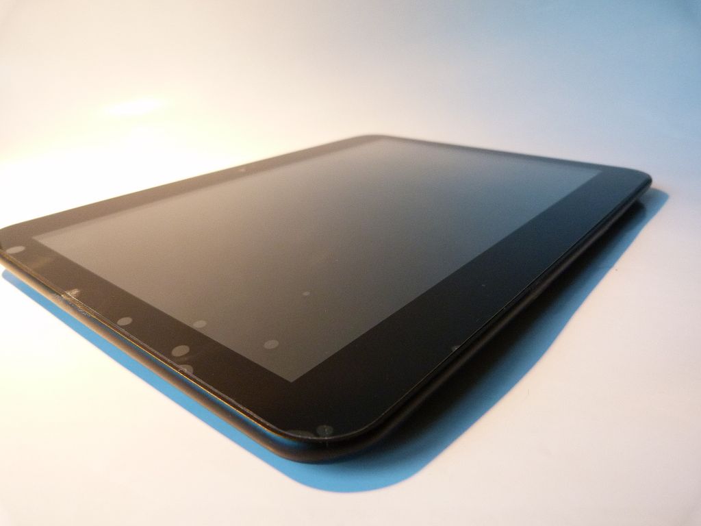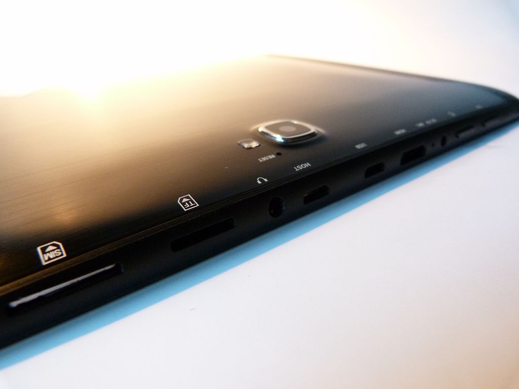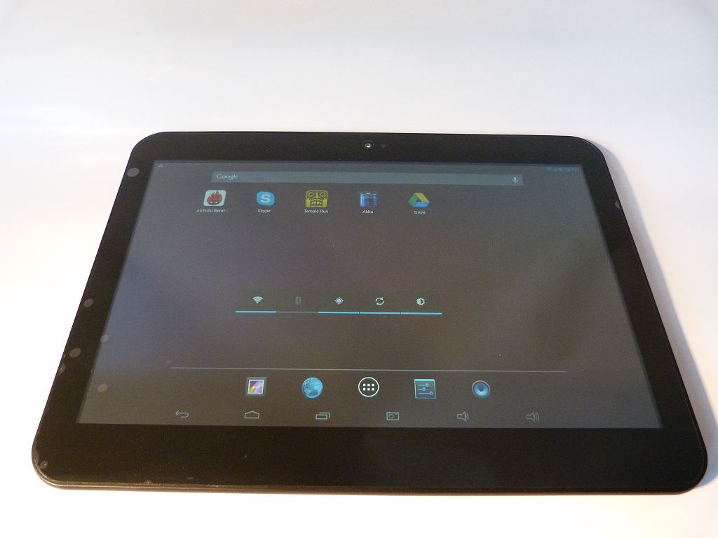 Die Vorderseite des Tablets ist wenig außergewöhnlich gestaltet, lediglich die Frontkamera ist hier zu finden. An der Oberseite des Gerätes finden wir eine Escape-Taste, die On-/Off-Taste, den Anschluss für das Ladegerät, das Mikrofon, einen Mini-HDMI-Anschluss sowie einen USB-Anschluss. Darüber hinaus ist hier ein weiterer USB-Anschluss untergebracht, der für die USB-Host-Funktion gedacht ist. Auch der Kopfhöreranschluss sowie die Einschübe für MicroSD und SIM-Karten sind hier zu finden.