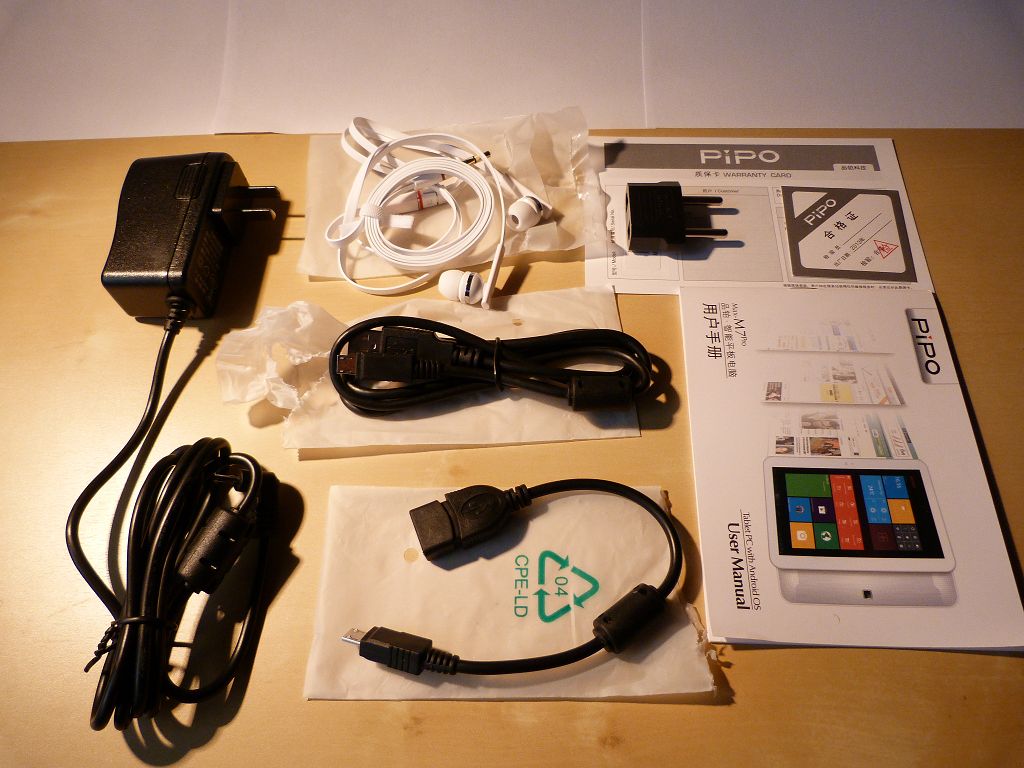 Das Pipo M7-Pro wird in einem weißen Karton geliefert, der weder billig noch besonders spektakulär wirkt und somit einen guten ersten Eindruck erweckt. Enthalten ist das (durch einige Folienverpackungen gut geschützte) Tablet, eine Garantiekarte, eine Anleitung auf chinesisch, ein USB-Verbindungskabel, ein Ladegerät inklusive Adapter für u.a. deutsche Steckdosen, Kopfhörer sowie ein USB-Host-Kabel.