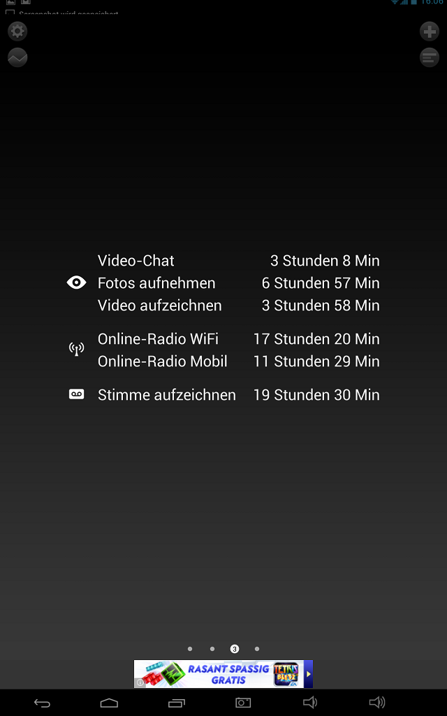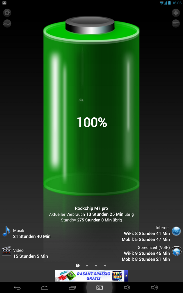 Der verbaute 6400mA Akku hält im Vergleich zu anderen Tablets außergewöhnlich lange. Folgende Ergebnisse wurden im Test mit Akku HD erreicht: