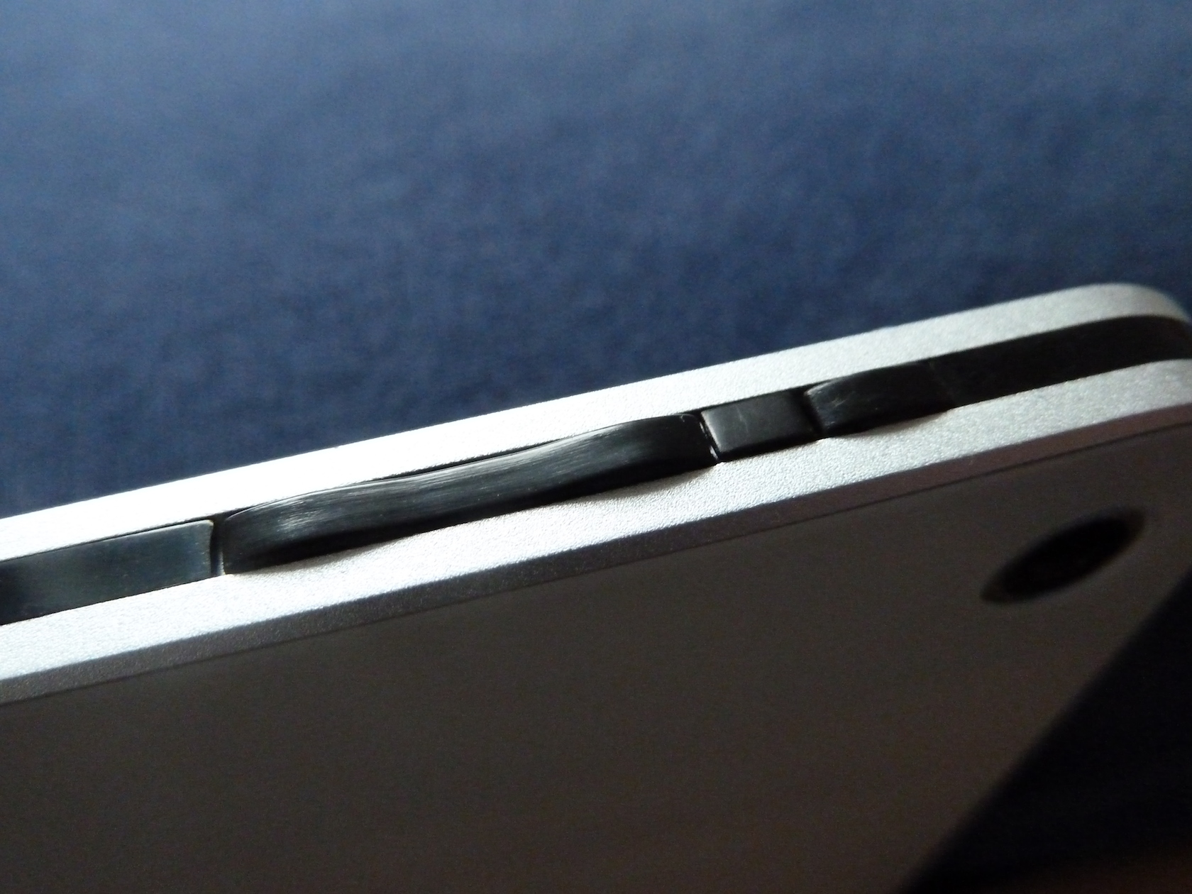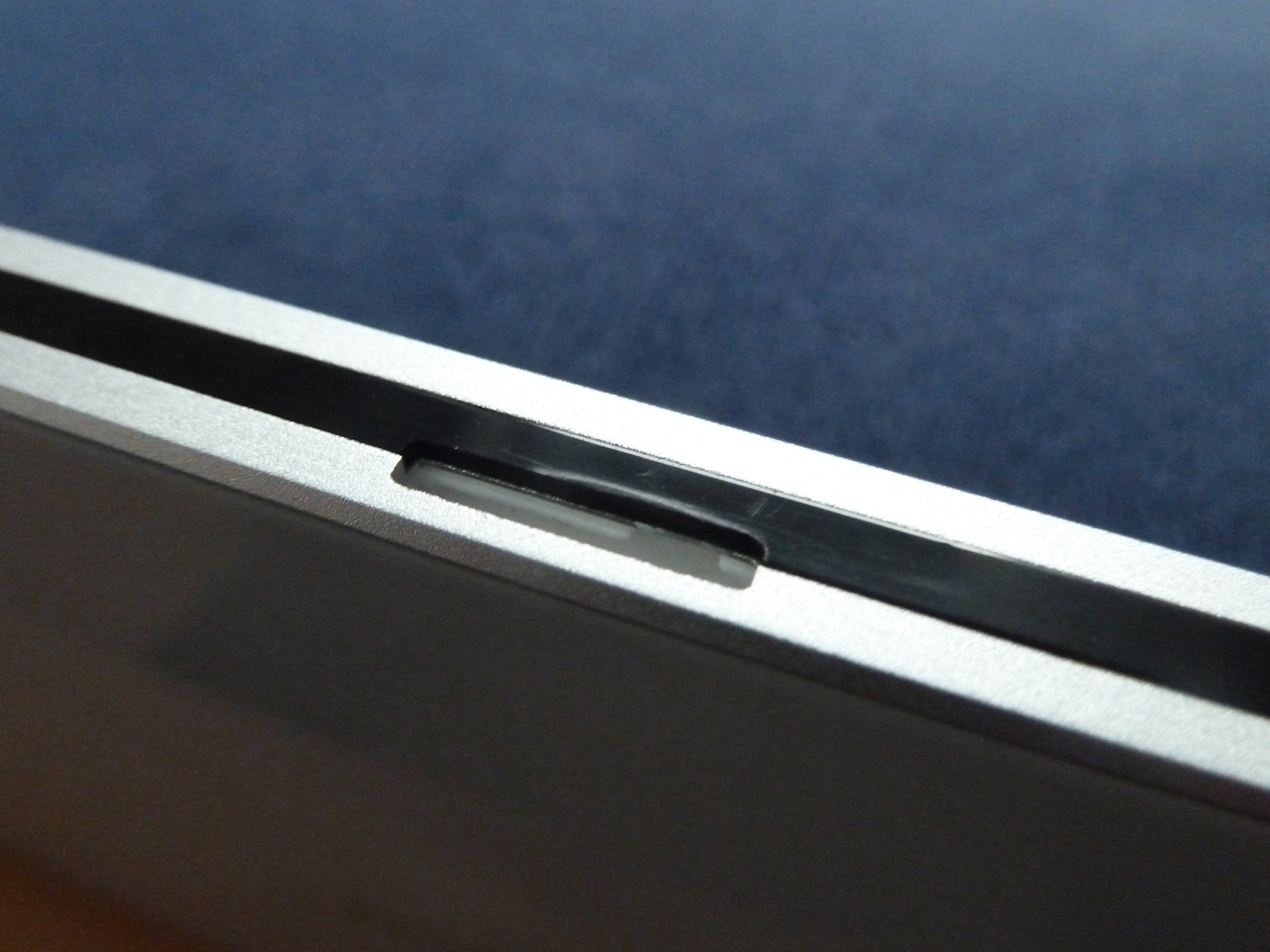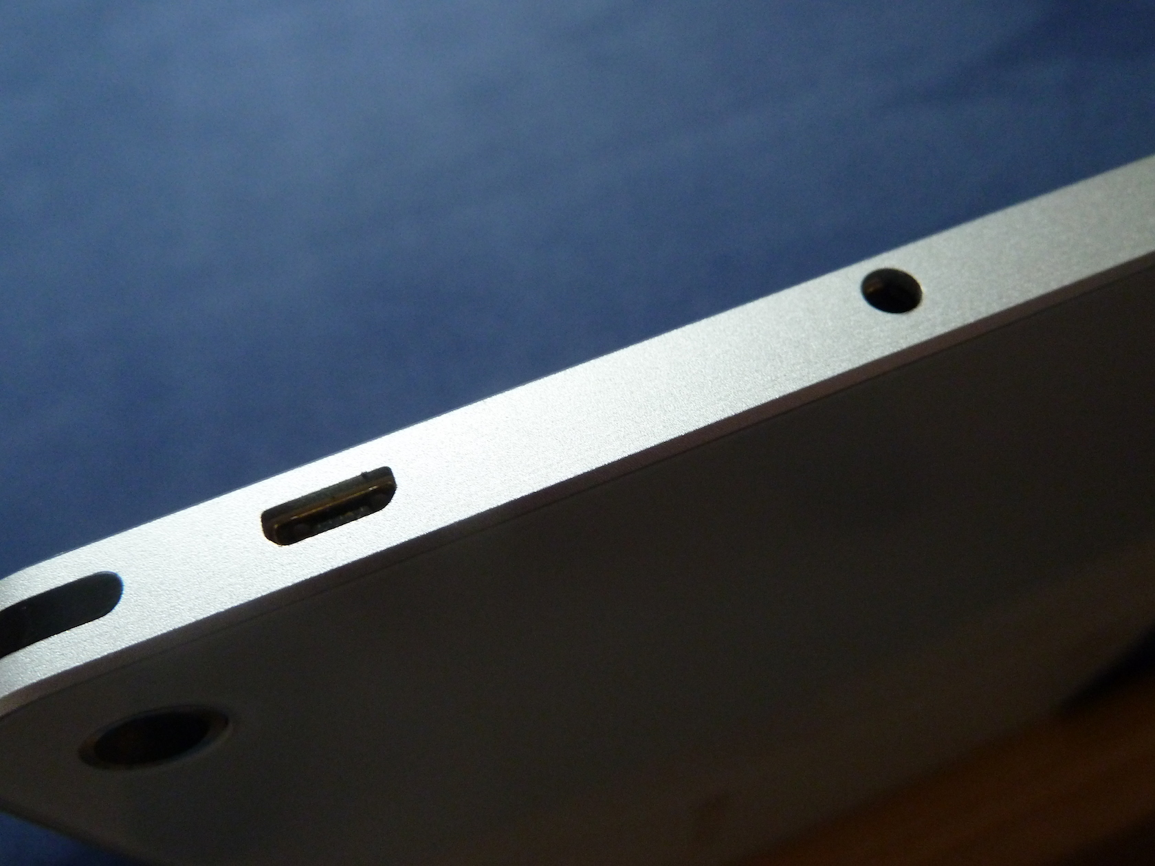 Wie auch die Vorder- und Rückseite des Tablets, ist ebenso der Rahmen elegant designed und spärlich bestückt. Der Rahmen besteht komplett aus gefrästem Aluminium und ist sehr gut verarbeitet. Hier finden wir auf der oberen Seite links die einzigen Knöpfe des Tablets (Ein / Aus und Lautstärke), sowie mittig den Micro SD Schacht. Auf der linken Seite des Tablets finden wir einen Micro USB Port, welcher auch zum Laden des Tablets dient, sowie einen Kopfhöreranschluss. Links unten, sowie rechts an der gleichen Stelle, finden wir jeweils einen Lautsprecher.