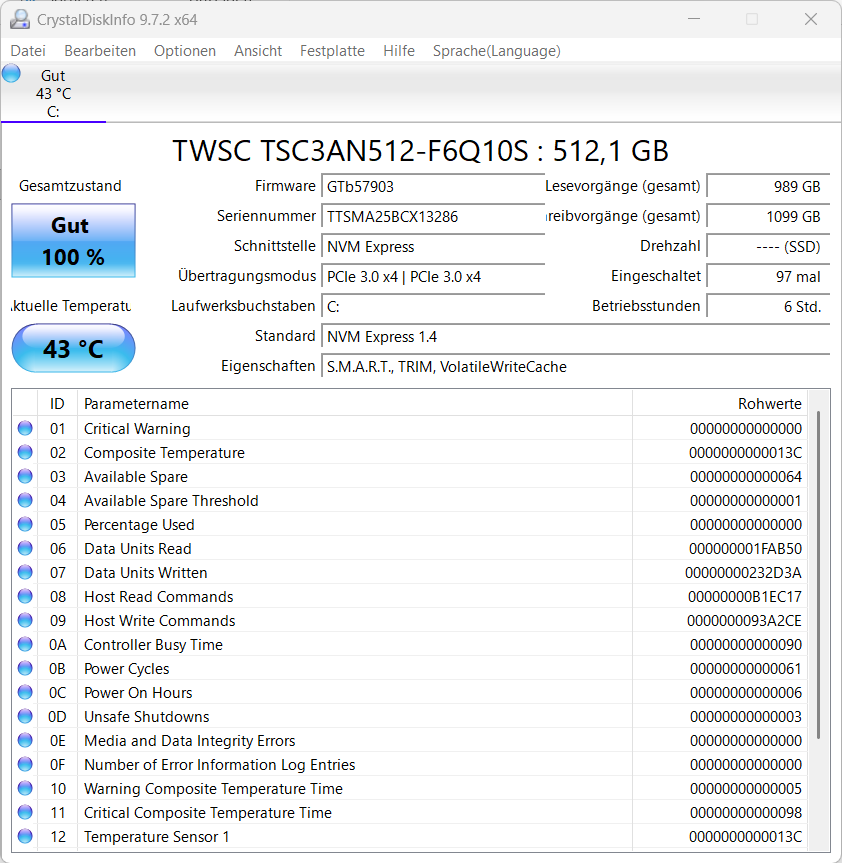 | Speicher | 1x M.2 2280 PCIe 4.0 x4 Slot Ab Werk: 512GB Techwinsemi TWSC TSC3AN512-F6Q10S M.2 2280 PCIe 3.0 NVMe SSD SSD Controller: Unbekannt / generisch |