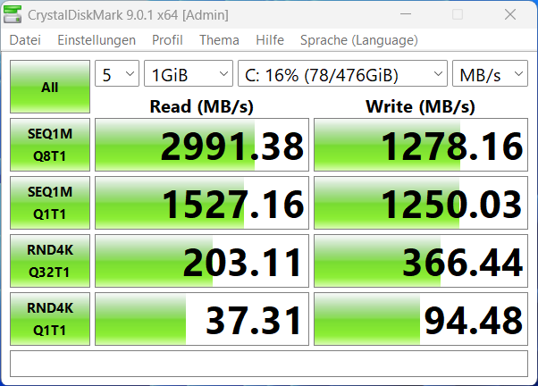 Die werksseitig im Chuwi CoreBook Air verbaute SSD stammt im Gegensatz zur CoreBook X Serie diesmal von Techwin Semiconductor. Konkret wird hier das Modell TWSC TSC3AN512-F6Q10S verbaut. Die SSD liefert im Benchmark solide Lese- und Schreibraten, sowohl bei sequenziellem als auch zufälligem Zugriff. Für die Leistungsklasse dürfte das den meisten Anwendern völlig ausreichen. Zuverlässigkeitsprobleme wie korrupte Daten gab es im Stress Test mit größeren Datenmengen nicht.