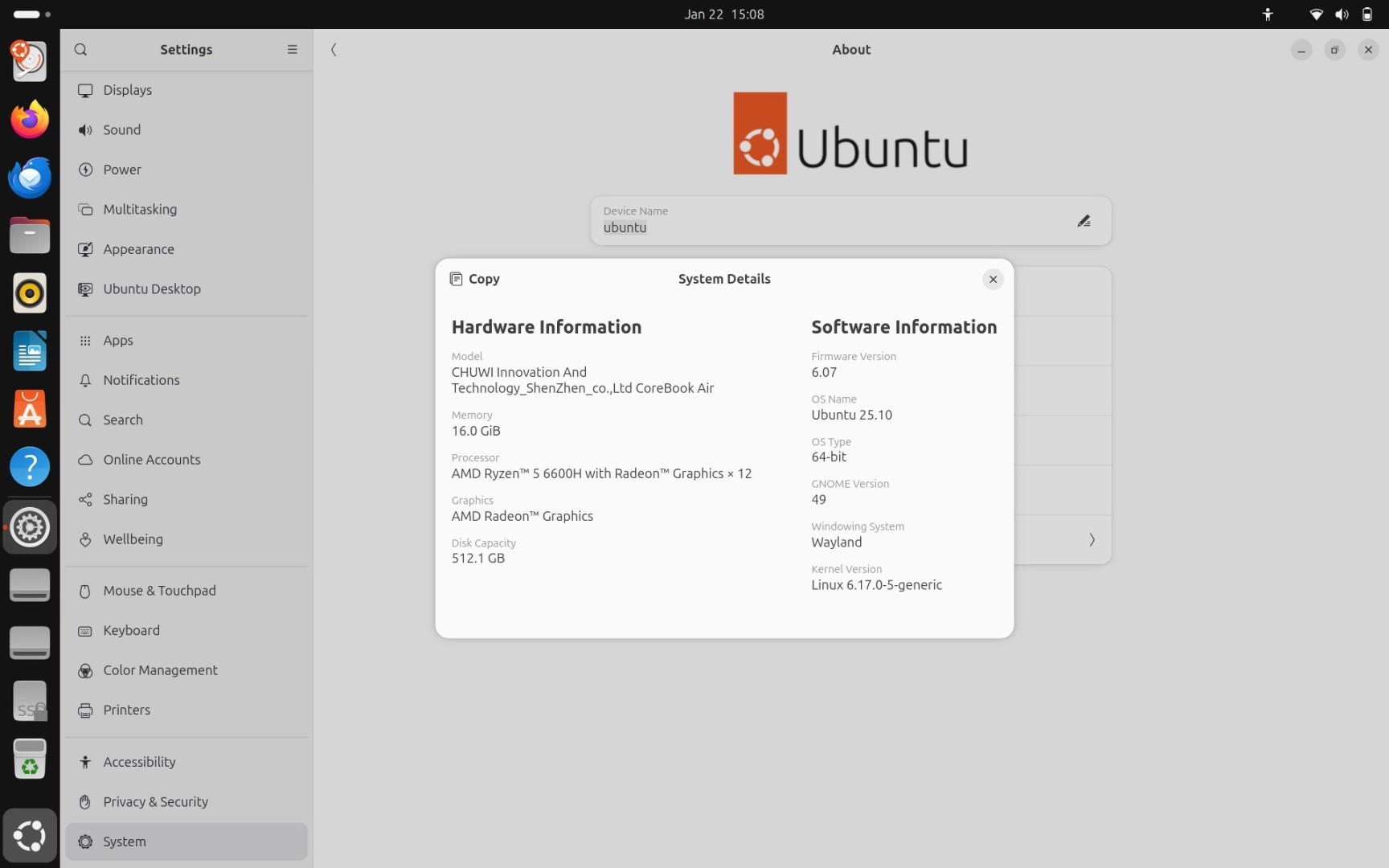 Linux ist auf dem Chuwi CoreBook Air eingeschränkt nutzbar. Prinzipiell wird zwar die gesamte Hardware erkannt und es funktioniert auch alles reibungslos - bis auf Audio. Die internen Lautsprecher geben keinen Ton von sich, obwohl der Soundchip erkannt wird und auch funktioniert. Der 3,5mm Ausgang sowie das Mikrofon funktionieren nämlich. Lediglich die Lautsprecher bleiben stumm. Getestet wurde mit Ubuntu 25.10. Vermutlich benötigt das Laptop eine spezielle Pin Configuration, damit die Lautsprecher funktionieren.