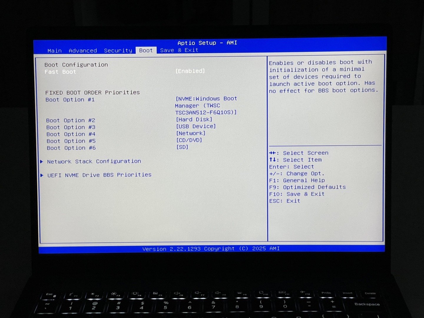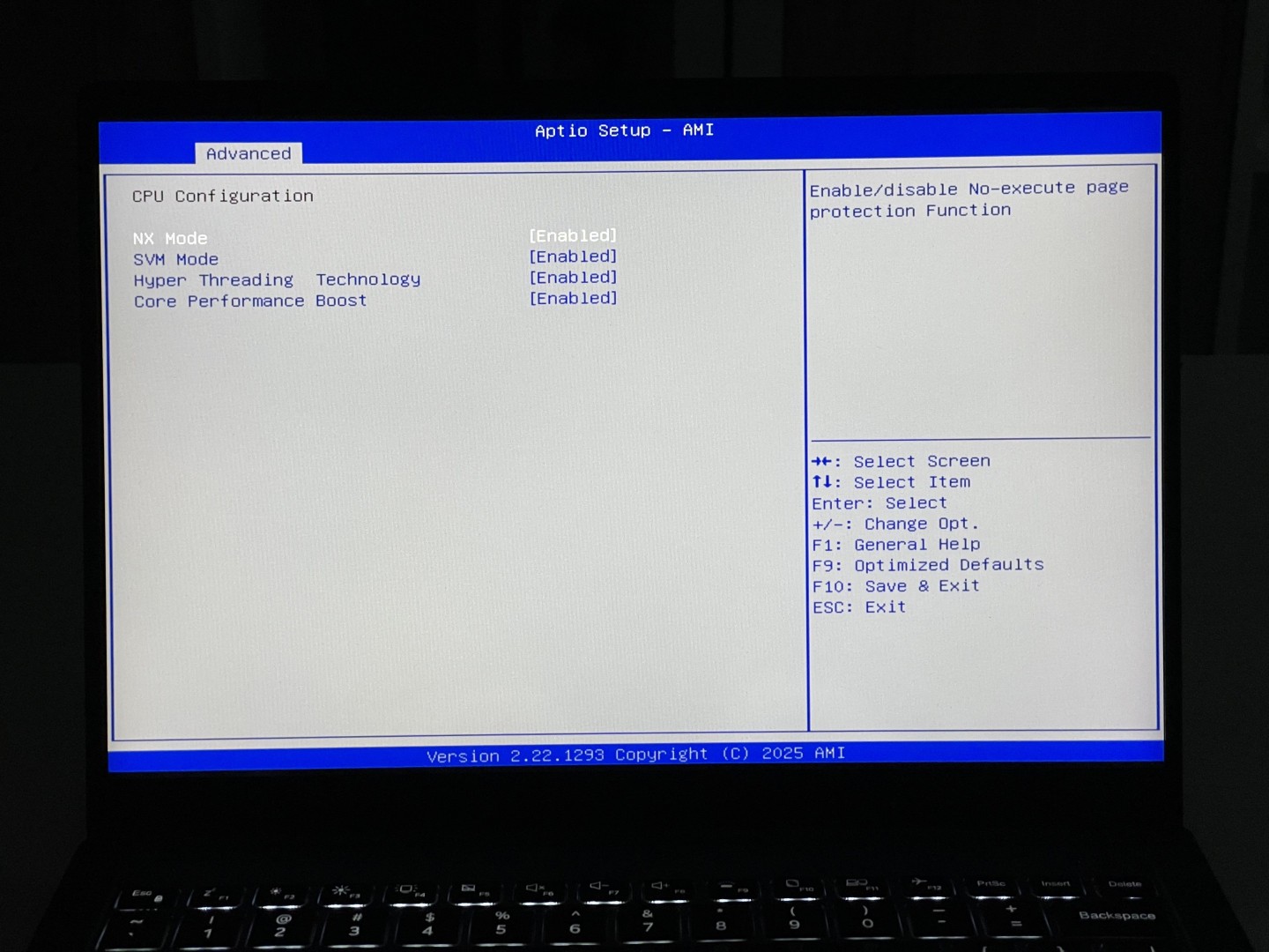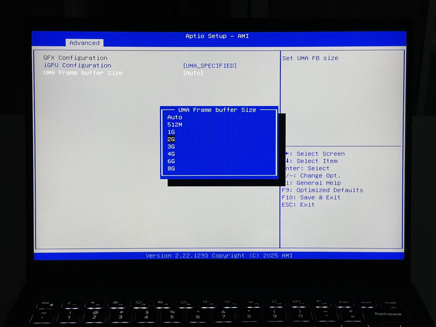Das BIOS / UEFI Menü ist beim Chuwi CoreBook Air gesperrt. Genutzt wird wie gewohnt die AMI Aptio Firmware. Zugänglich sind nur grundlegende Einstellungen. Die Tastatur-Beleuchtung lässt sich auf Betrieb ohne Timeout umstellen, die Funktionstasten auf Tastenkombination mit FN oder ohne FN. Den zugewiesenen festen Grafikspeicher kann man ebenfalls anpassen, ebenso den RAM Takt. Nicht zugänglich sind hingegen Power Limit Einstellungen für die CPU. Secure Boot ist standardmäßig aktiv, kann aber auch deaktiviert werden. Das Booten von USB Medien ist problemlos möglich.