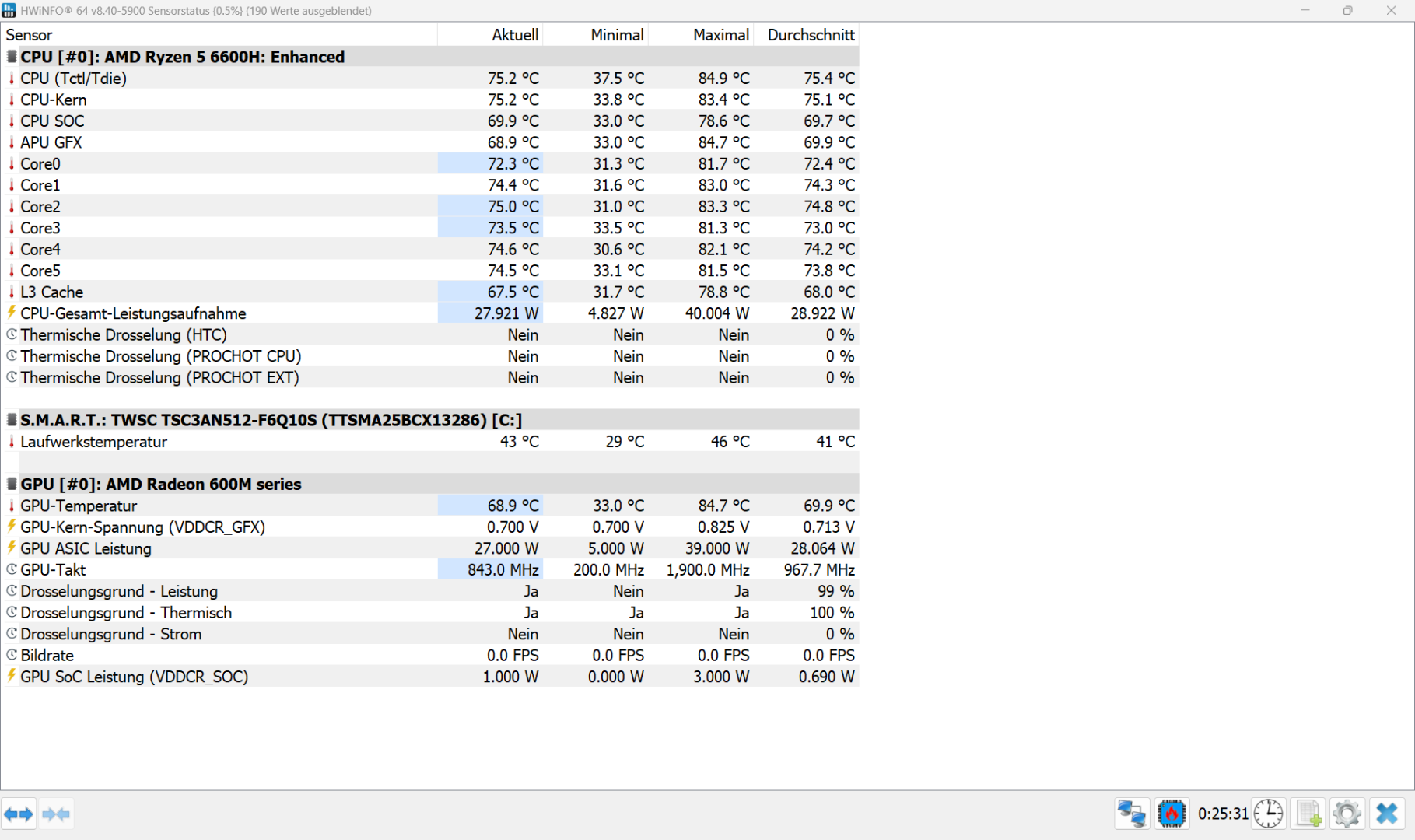 | Prozessor | AMD Ryzen 5 6600H (TSMC 6nm) 6x Zen 3+ @3,3GHz bis 4,5GHz (12 Threads) Power Limit: 45W TDP limitiert auf 28W |