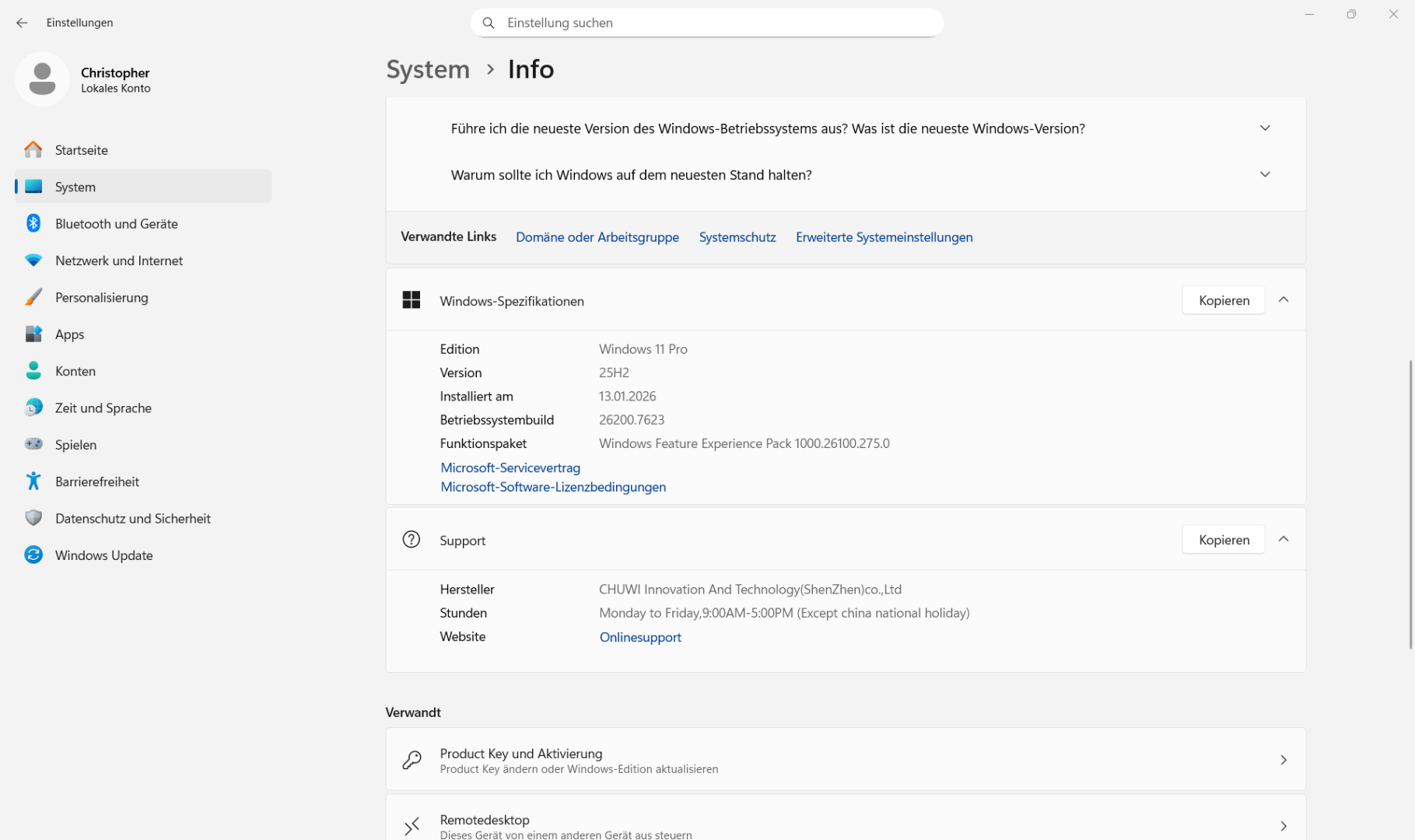| Bloatware | Nein (nur Chuwi Service App), Windows 11 Bloatware ab Werk entfernt, Microsoft Office mit Lizenz vorinstalliert |