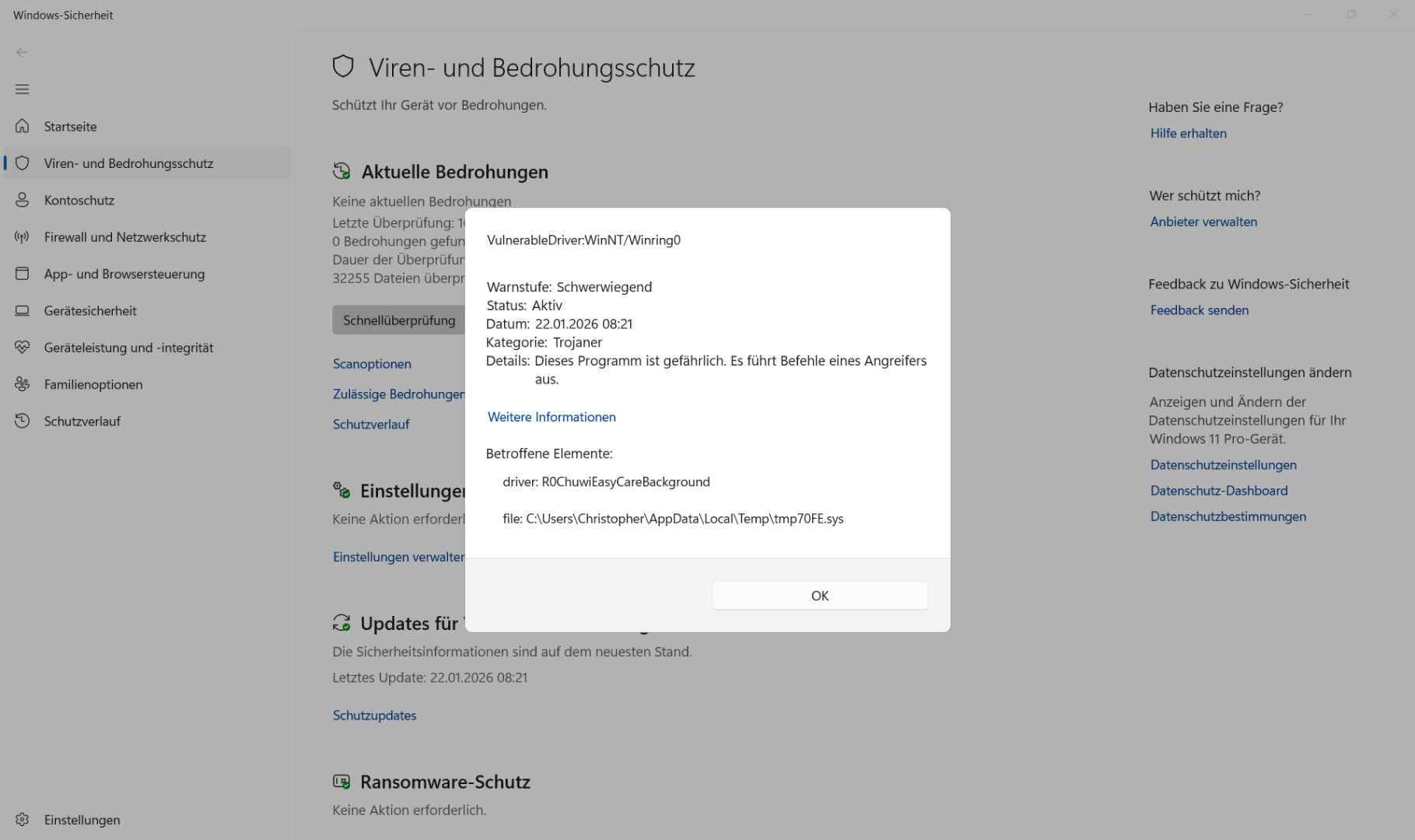 Um sicher zu gehen, wurde anschließend das System mithilfe des offiziellen Restore Images von Chuwi auf eine zweite SSD neu installiert. Nach Installation aller Windows Updates, um auf denselben Stand wie die bisherige Installation zu kommen, wurde abermals ein Scan mit Windows Defender durchgeführt. Auch hier sprang Defender wieder auf den Hintergrundprozess von Chuwi EasyCare an. Eine Deinstallation der Software behebt das Problem. Insofern ist nicht nachvollziehbar, warum Chuwi das Problem angeblich nicht reproduzieren kann.
