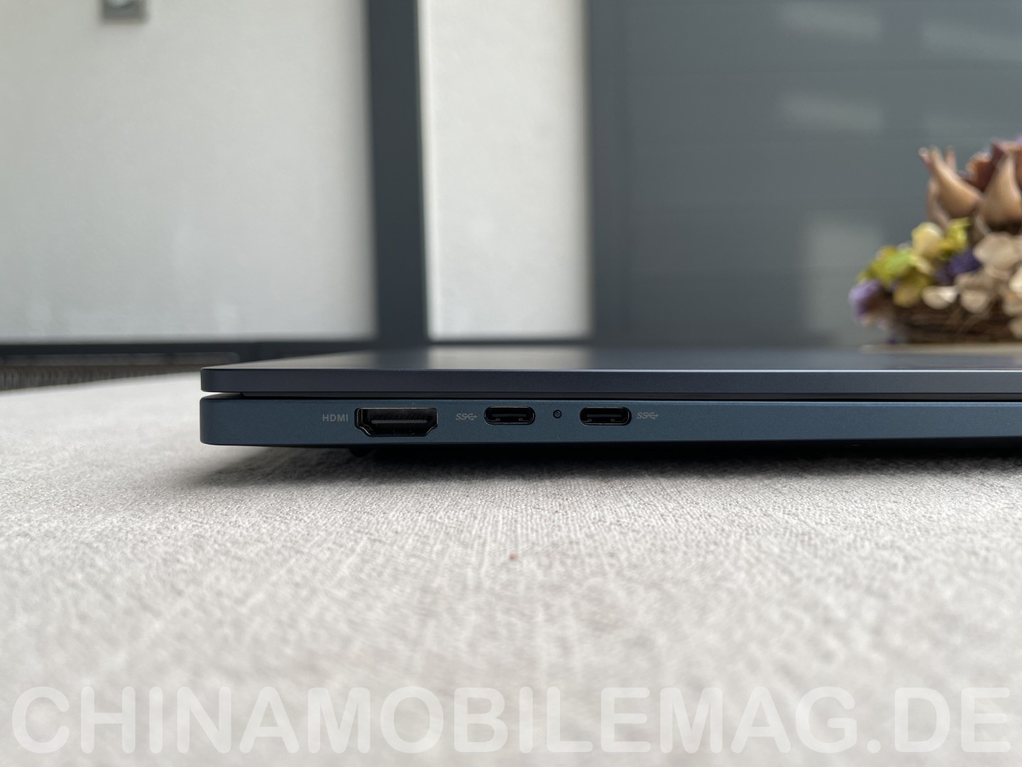| Anschlüsse | 1x USB-A USB 3.2 Gen1 5Gbit/s (rechts) 2x USB-C USB 3.2 Gen2 10Gbit/s + USB-PD + DP (links) 1x USB-C 2.0 (rechts) 1x HDMI 2.1 Full Size (links) 1x 3,5mm Audio In / Out (rechts) |