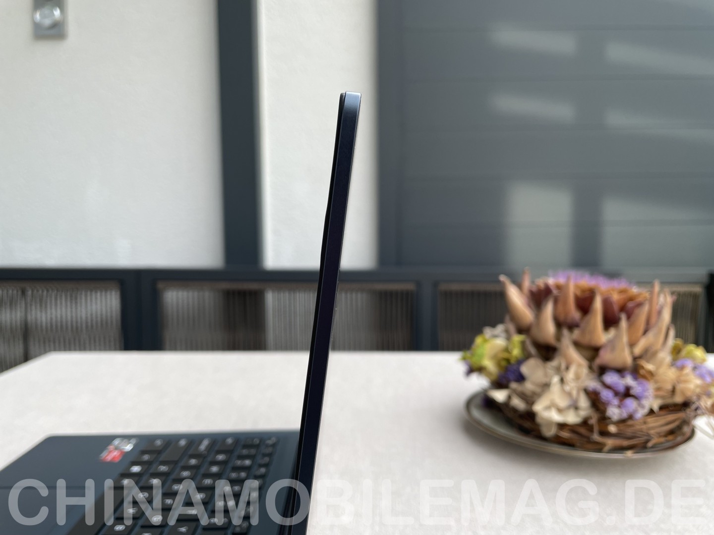 An den Materialien hat sich nicht großartig was verändert. Das Display vom Chuwi CoreBook Air besteht an der Außenseite nach wie vor aus Metall. Lediglich die Materialstärke hat abgenommen, was es auf den ersten Eindruck wie Kunststoff wirken lässt. Beim Kratzen mit dem Fingernagel oder in kalter Umgebung merkt man aber eindeutig, dass es sich um ein anderes Material als beispielsweise beim Top-Case aus Kunststoff handelt. Durch die geringere Materialstärke am Display lässt sich dieses natürlich etwas leichter biegen, aber das ist bei schlanken und leichten Laptops ja nichts Ungewöhnliches.