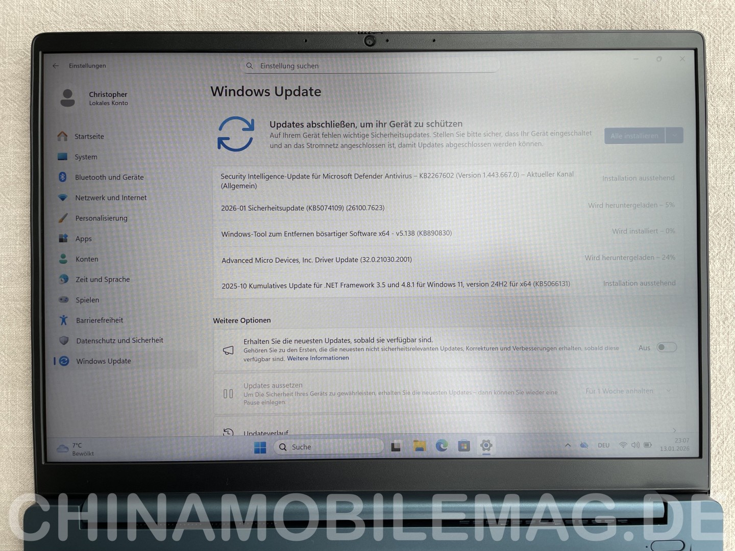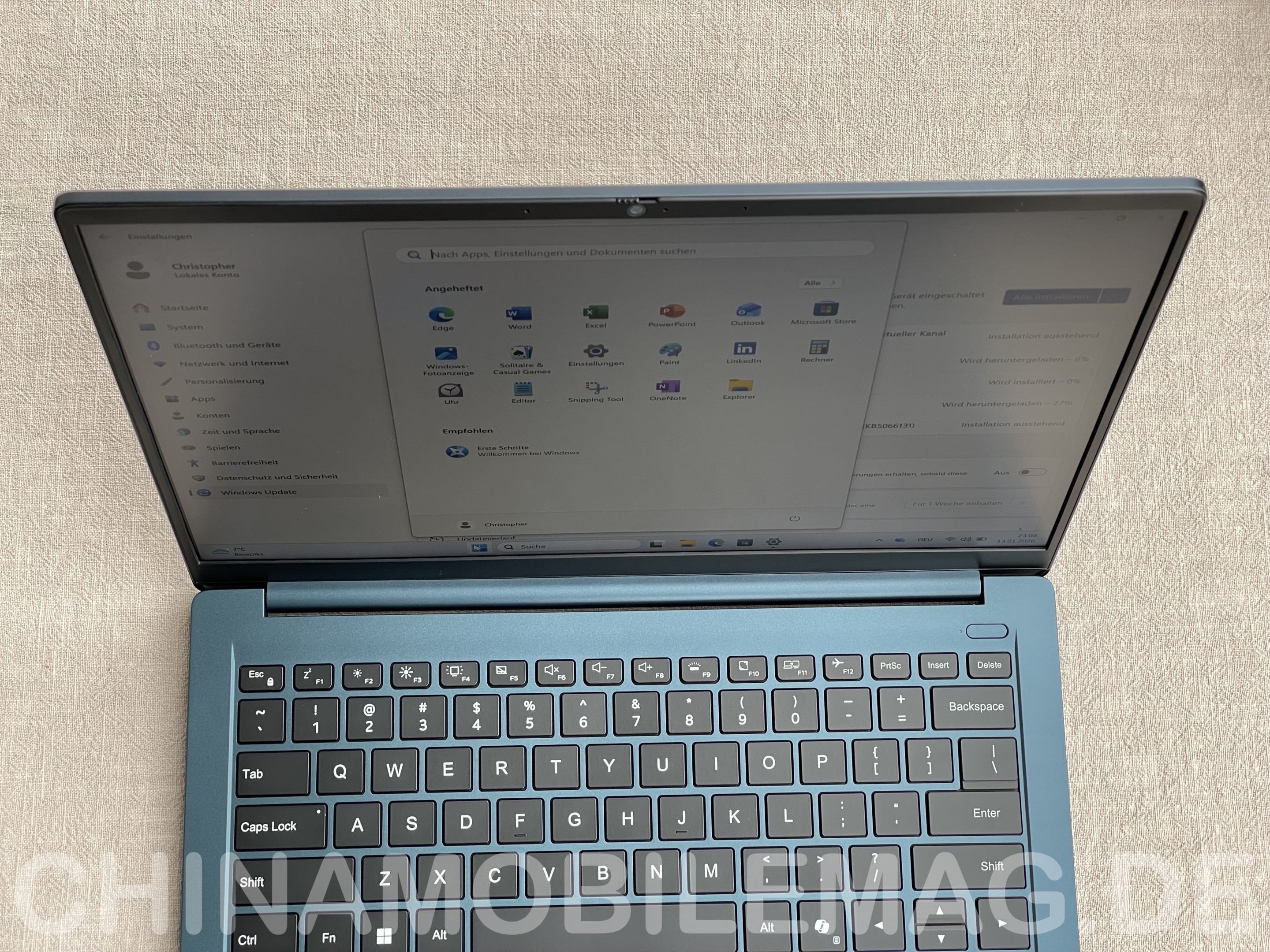 Das Chuwi CoreBook Air wird mit Windows 11 Pro ausgeliefert - wie gewohnt mit Lizenz, die Aktivierung ist also erfolgreich. Das System bietet ab Werk deutsche Sprache zur Wahl und die Installation wurde angepasst um ohne Microsoft Konto sowie offline eingerichtet werden zu können. Zudem hat Chuwi die übliche Windows Bloatware entfernt. Vorinstalliert ist Microsoft Office Professional Plus 2024 und das sogar mit Lizenz. Die Windows Updates funktionieren problemlos.