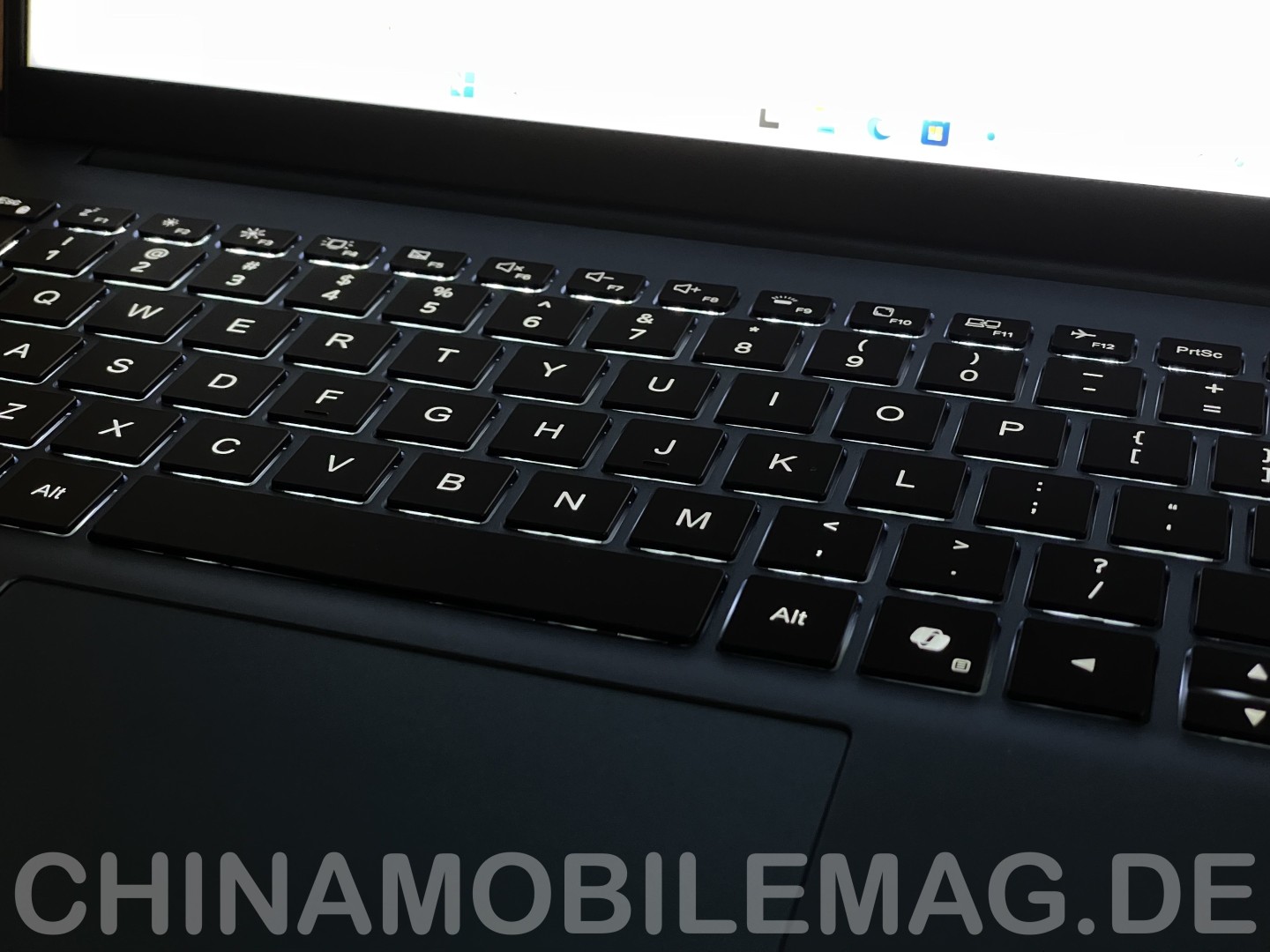 Qualitativ ist die Tastatur im Chuwi CoreBook Air abermals exzellent. Die Tastatur liefert ein angenehmes Schreibgeräusch, das einen eher dumpfen und nicht klapprig wirkenden Tastenaschlag besitzt. Die Tasten sind stabil und lass sich sowohl mittig als auch von den Seiten zuverlässig betätigen. Der Schreibfluss ist insgesamt sehr gut und es treten keine übersprungenen oder doppelt erkannten Tastenanschläge auf. Sehr gut ist außerdem das Federverhalten der Tastatur. Bei normalen Schreiben federt diese praktisch nicht und macht einen sehr soliden Eindruck, was auch das Schreibgefühl angenehmer macht. Man muss schon relativ fest auf die Tastatur drücken, bis sich diese nach innen biegt.